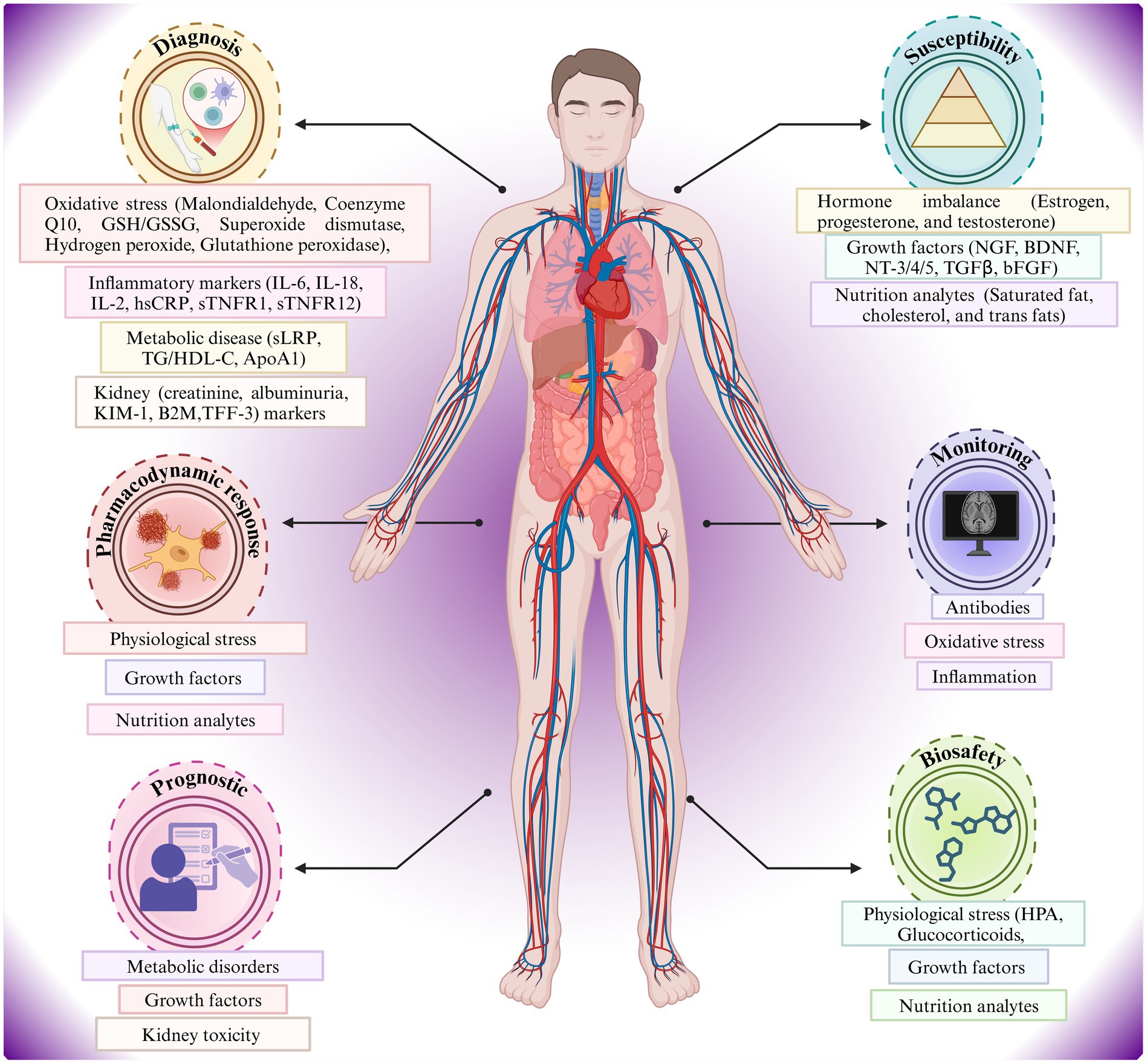 Figure 1 portrays a relationship between the human body and the metabolic, inflammatory, oxidative stress, hormonal imbalance, and blood-based biomarker indicators of AD risk (Hampel et al., 2023). Diagnostic, susceptibility, monitoring, prognostic, and pharmacodynamic factors are shown in a systems-biology framework, indicating the effects of oxidative stress, metabolic disease, hormone imbalance, and nutritional analytes on the pathophysiology and individualized monitoring of AD (Teunissen et al., 2022). Key biomarkers include Aβ isoforms, phosphorylated tau, neurofilament light chain (NFL), and inflammatory proteins (Leuzy et al., 2022). Also, the figure highlights the multi-system and applicability of biomarker analysis in the management and risk stratification of AD.