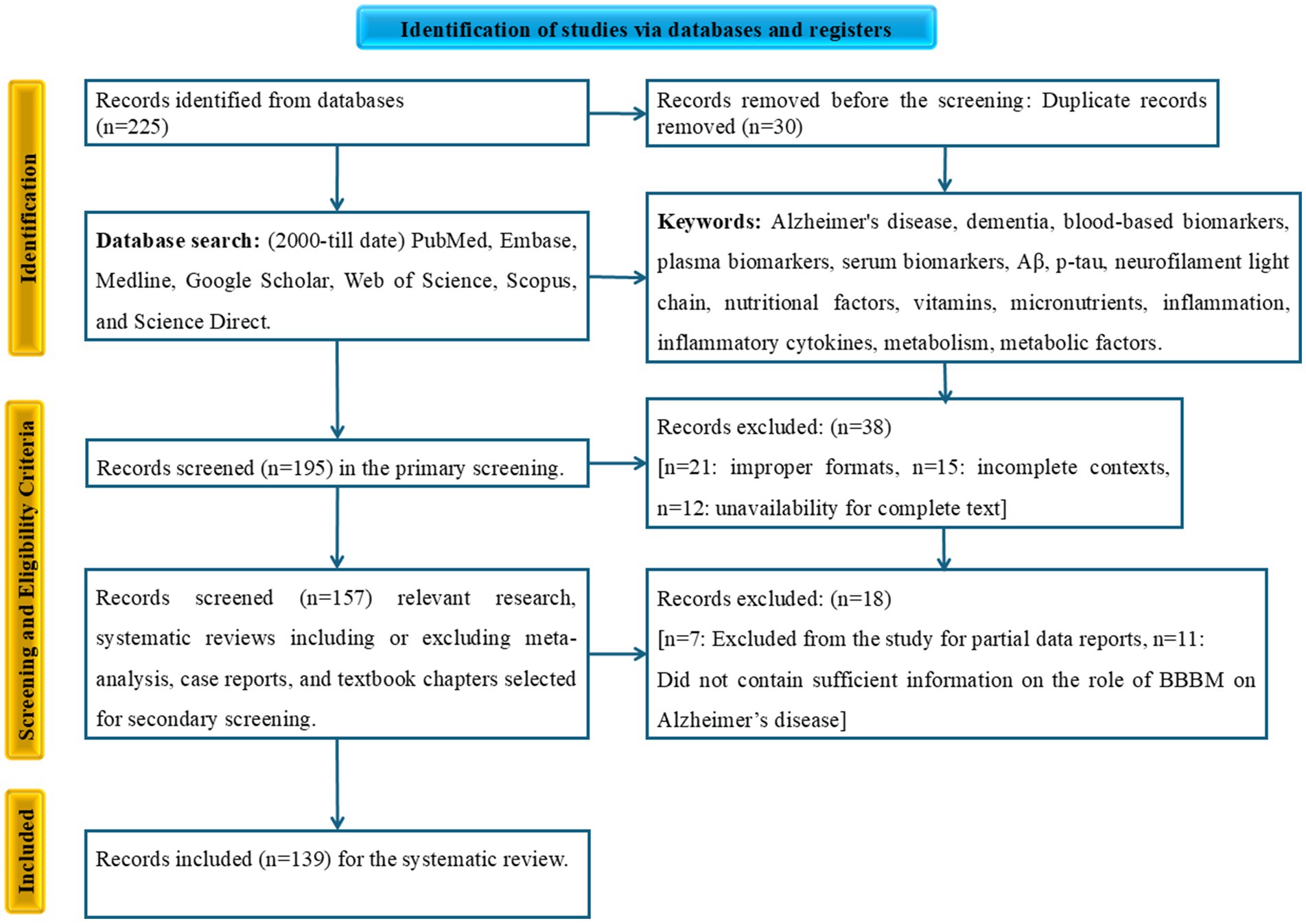 All identified articles were evaluated based on a strict set of inclusion and exclusion criteria. We focused on studies that explored the relationship between blood-based biomarkers for AD and various nutritional, inflammatory, or metabolic factors in human subjects. An initial screening of records was conducted. After this, we identified and removed duplicate reports. Subsequently, a secondary screening was performed by assessing the titles and abstracts for relevance. Full-text articles were then retrieved and evaluated for eligibility. The final articles included in the review were those that met all inclusion criteria, such as being published in English, involving human subjects, and discussing the relationship between AD blood-based biomarkers and the specified biological determinants. Original research, systematic reviews, or meta-analyses. The exclusion criteria were animal studies or in vitro research, non-English articles, conference abstracts, editorials, or opinion pieces, and studies not focused on the specified biological determinants or blood-based biomarkers. The number of studies at each stage of this selection process will be detailed in the PRISMA flow diagram (Figure 2).