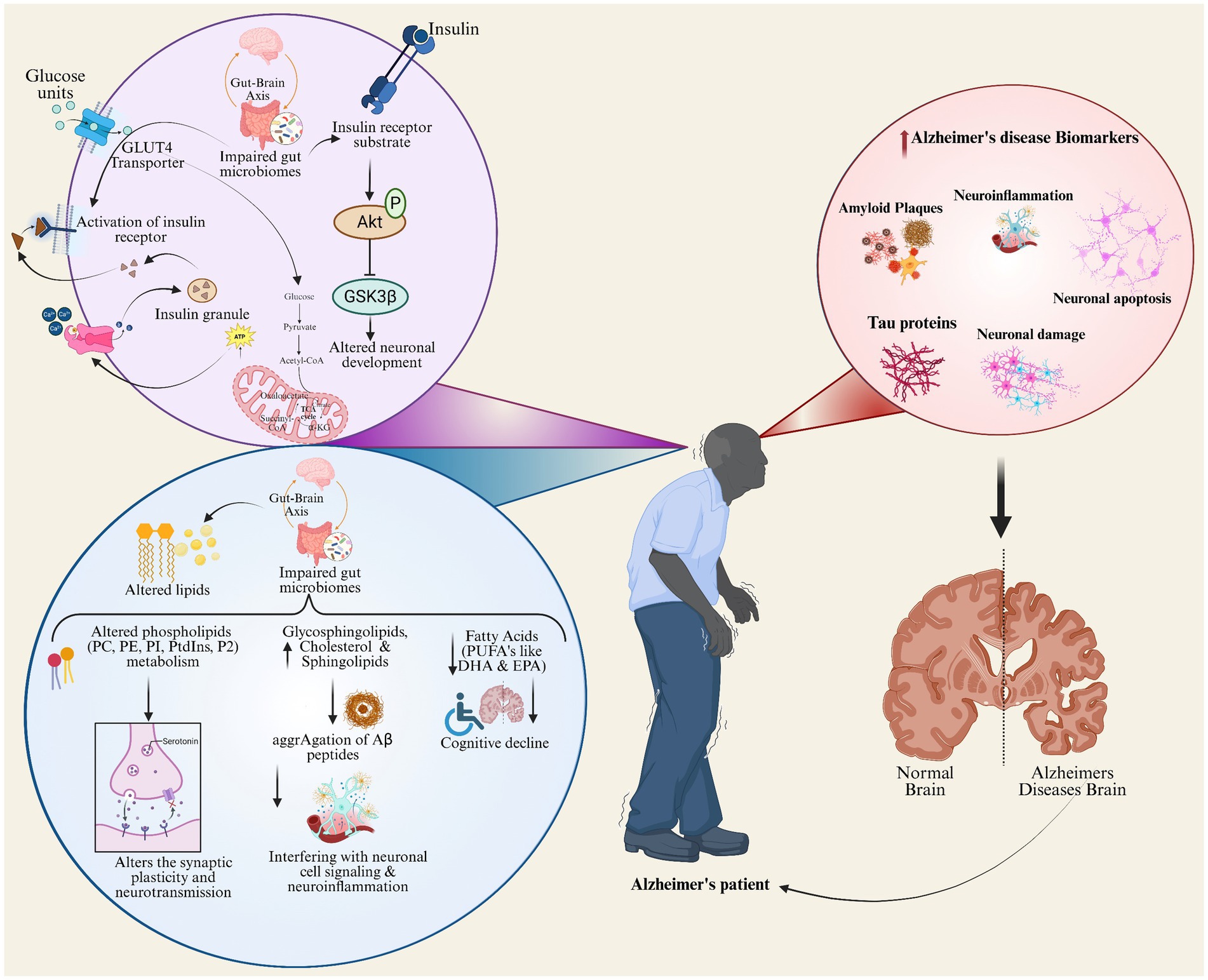 Another important issue of research related to AD is lipid metabolism. Parent research using lipidomic has shown that people with AD are characterized by specific lipid patterns compared to the healthy population. Abnormalities in the levels of different lipid categories, including sphingomyelins, cholesterol esters, and phosphatidylcholines, were reported to be elevated in AD patients (Yoon et al., 2022). Lipidomic analysis in a 2022 observational study revealed that specific plasma sphingomyelins and phosphatidylcholines were significantly altered in AD patients compared to controls, correlating with CSF p-tau181 and Aβ42/40 ratio. These molecular lipid changes could partly account for variability in blood biomarkers driven by metabolic status (Yoon et al., 2022). These lipid changes may also indicate the pathobiological process associated with neuronal degeneration. Particular lipid species have been linked to genetic risk factors for AD. For instance, some specific risk polymorphisms, including the SNPs identified as intimately associated with AD risk, exhibit incomparably diverse effects on plasma lipid levels. This means that various genetic susceptibilities may interact with metabolic factors to affect AD progression (Sun et al., 2024). Abnormal lipid concentrations lowered by statins have been linked to augmented deposition of amyloid-beta in the brain. Cholesterol is important for synaptic transmission, but increased cholesterol levels alter lipid rafts, which are important for amyloid precursor protein (APP) processing (Kang et al., 2017). Omega-3 fatty acids have a direct effect on the brain; they are believed to suppress inflammation and oxidation within the brain. On the other hand, dietary SFA has been indicated to be related to a high risk of AD due to its inflammatory impact (Li et al., 2022).