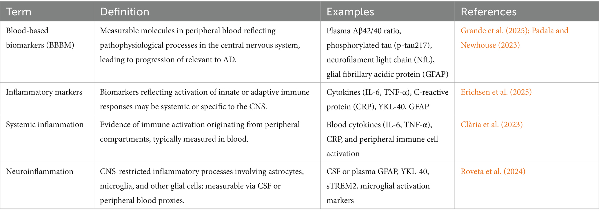 A biomarker is a measurable biological indicator used primarily to detect diseases. The term “biomarker” was first introduced in 1989, referring to specific biological substances, such as proteins or molecules, whose concentrations can be measured in individuals suspected of having a particular condition. Elevated levels of certain biomarkers in the bloodstream or other bodily fluids indicate a disease process (Alpert, 2011). In the context of AD, the clinical utility of blood-based biomarkers (BBBM) is often limited by their high biological variability. This variability arises from both fixed factors (age, sex, APOE-ε4 genotype) and modifiable influences (nutrition, inflammation, metabolic health), which can shift biomarker concentrations even in the absence of disease progression. For insight, plasma p-tau181 and Aβ42/40 ratios may differ by up to 20–30% between individuals with similar disease burden but different inflammatory or metabolic profiles (Teunissen et al., 2022). Understanding and accounting for such variability is critical to setting diagnostic cut-offs, interpreting longitudinal changes, and avoiding misclassification. Identifying these biomarkers is achieved through a systematic process involving blood sample collection, processing, and laboratory analysis. Of specific biomarkers utilizing techniques such as ELISA for proteins, PCR for DNA or RNA, and mass spectrometry for small molecules and metabolites(Thambisetty and Lovestone, 2010). These methods facilitate the detection and quantification of biomarkers, which are then evaluated against standard ranges. Deviations from normal levels may suggest the presence or progression of AD disease, underscoring the utility of BBBM as a significant tool in diagnosis and management (Mayeux, 2004). The major key determinants like blood-based biomarkers (BBBM), inflammatory markers, systemic inflammation, neuroinflammation, and their definitions are explained in Table 1.