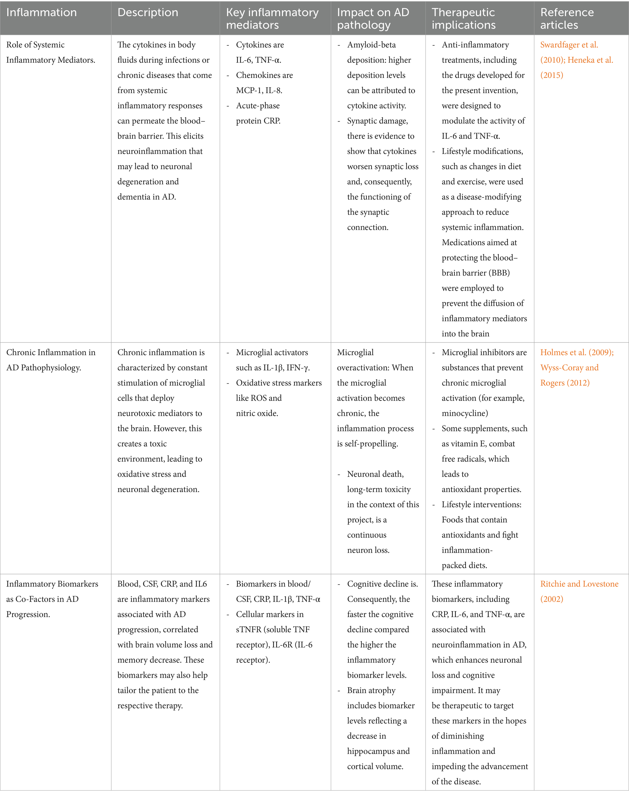 Understanding the role of inflammatory biomarkers opens avenues for therapeutic interventions. Anti-inflammatory strategies strive for the suppression of certain inflammatory processes to minimize the impact of neuroinflammation on the health of neurons. Similarly, blocking TNF-α or IL-1β action likely reduces the toxicity of Aβ without compromising the beneficial actions of these molecules (Leuzy et al., 2022). Table 2 provides a comprehensive overview of the major systemic and neuroinflammatory mechanisms implicated in AD, describing key inflammatory mediators - such as cytokines (IL-6, TNF-α), chemokines (CCL2/MCP-1, IL-8), and acute-phase proteins CRP- that drive pathological changes (Swardfager et al., 2010; Heneka et al., 2015). For each mechanism, the table specifies relevant biomarkers that are detectable in human blood or CSF, explains their clinical and experimental links to amyloid plaque formation, tau hyperphosphorylation, synaptic dysfunction, and neuronal loss, and outlines current or potential therapeutic interventions aimed at modulating these immune pathways (Leuzy et al., 2022). The evidence and implications summarized in the table are synthesized from leading primary research and meta-analyses to support clinicians and researchers in understanding how inflammation interacts with AD biomarker variability.