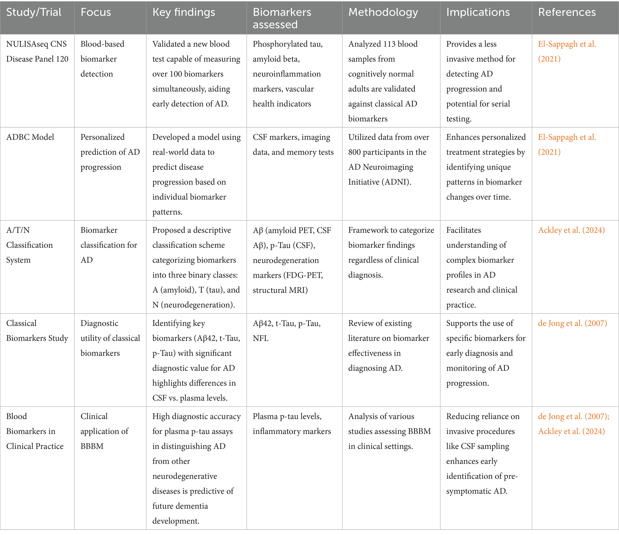 The current standard practices for diagnosing AD include neuroimaging (e.g., PET scans) and cerebrospinal fluid (CSF) analysis, which are expensive and inaccessible in many settings. The determination of BBBM is less invasive, making it more patient-friendly. The benefits are proposed in the idea of possible early detection of disease in individuals and consequent treatment, which would change the course of the disease (Hansson et al., 2023). Blood biomarker discovery has been a topic of active research in AD during the last few years, and the following factors are related to AD pathology, the phosphorylated tau protein (p-tau), amyloid-ß (Aß42), and Aß42/Aß40, which have been in the limelight because these biomarkers are well related to the pathology of AD as seen in the CSF and imaging analysis. For instance, research has shown that increased plasma p-tau217 can differentiate patients suffering from Alzheimer’s from those diagnosed with other neurological disorders (Schneider, 2017; Delgado-Peraza et al., 2021).