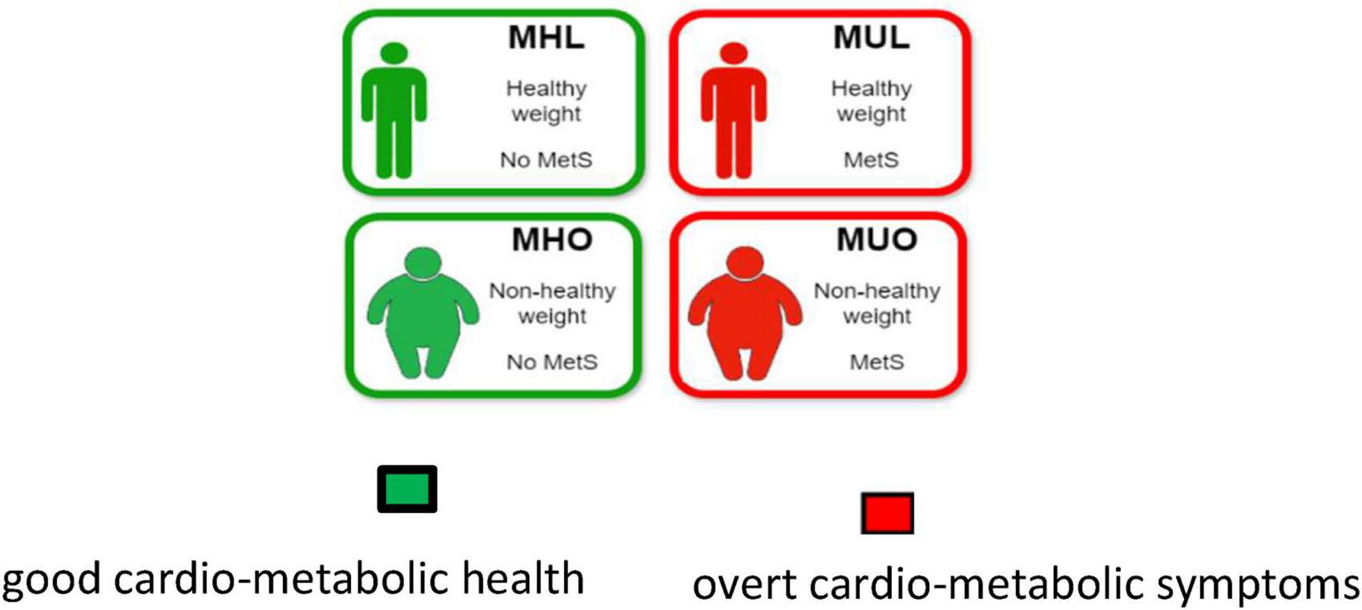 Figure 1. Stratification of adult population into four groups based on their combined obesity and metabolic status: metabolically healthy obese (MHO), metabolically unhealthy obese (MUO), metabolically healthy lean (MHL) and metabolically unhealthy lean (MUL) subjects.