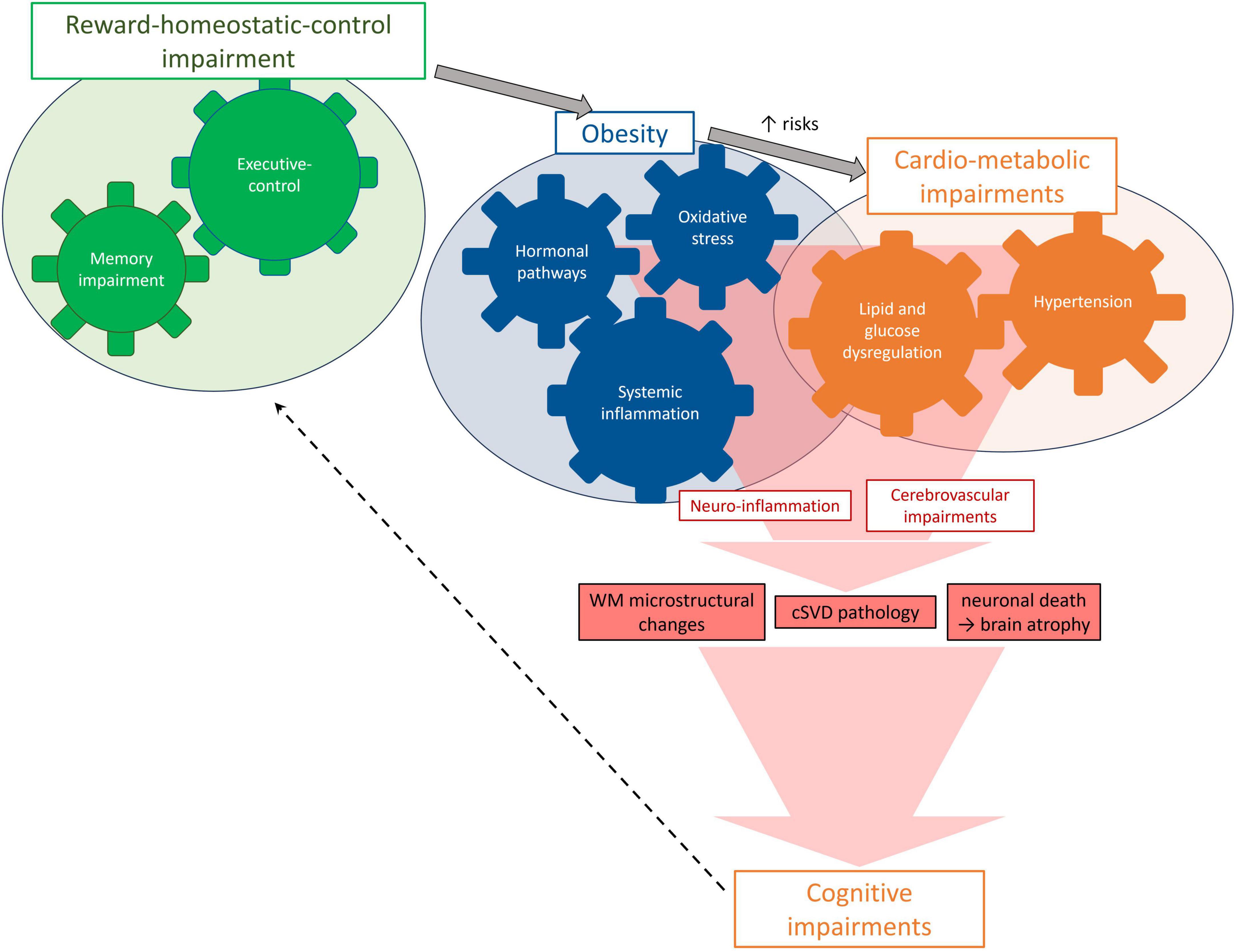 Overall, this evidence suggests a pathway linking obesity and cognitive impairments, through cardio-metabolic dysfunction and neuroanatomical alterations.