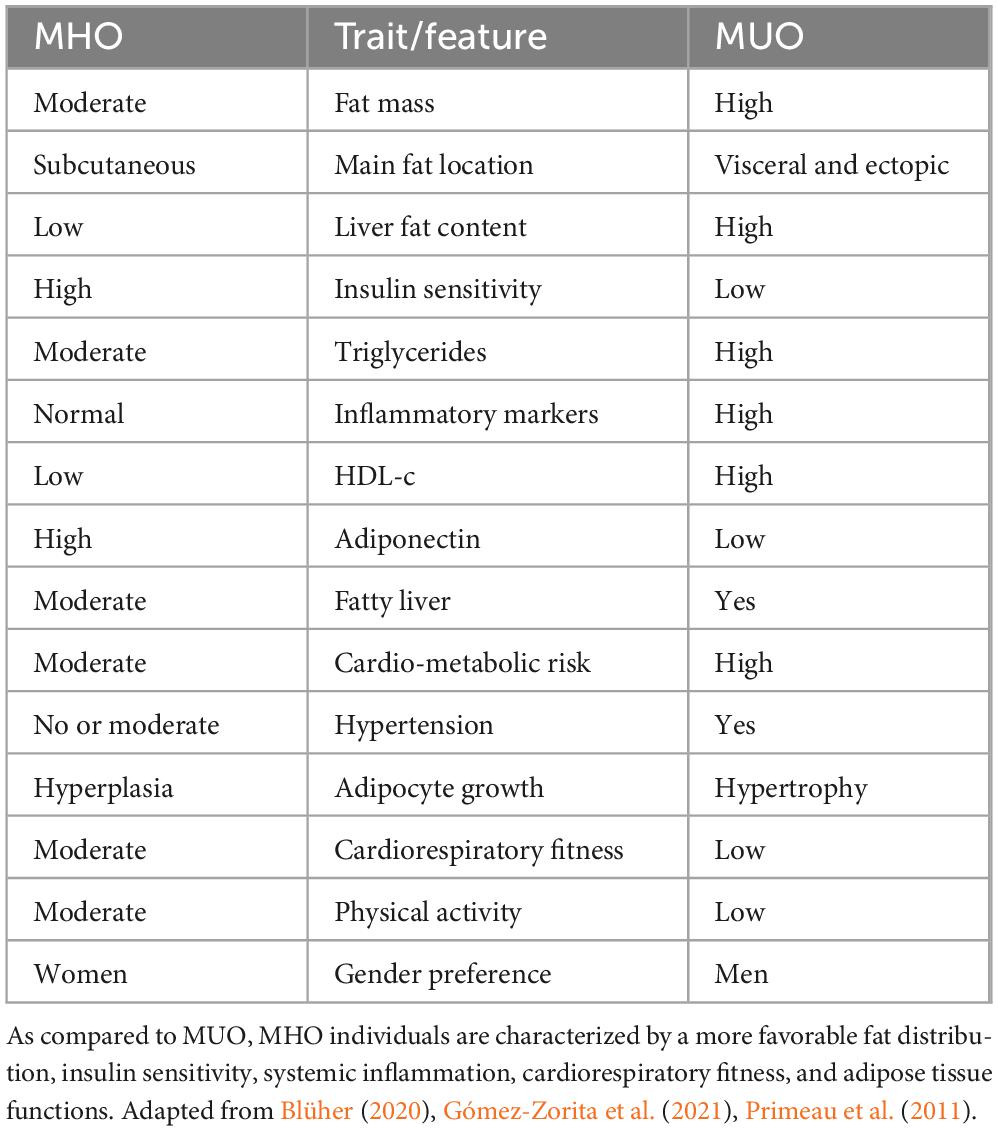 Recent meta-analyses have listed a number of physiological and phenotypic differences of MHO as compared to MUO individuals. Indeed, compared with MUO, MHO individuals are characterized by a milder degree of obesity, a more recent onset of overweight/obesity, and a more favorable fat distribution, characterized by greater subcutaneous rather than visceral or ectopic fat accumulation (Blüher, 2010; Eckel et al., 2016; Gómez-Zorita et al., 2021; Janssen et al., 2004; Ma et al., 2019; Primeau et al., 2011). They also demonstrate better hormonal control, higher insulin sensitivity, lower liver fat content, lower concentrations of hepatic enzymes, more favorable blood lipid profile, reduced atherosclerosis, less altered adipose tissue functions, smaller adipose cell sizes, and lower levels of systemic inflammatory markers. Lifestyle and functional traits also tend to be more favorable in MHO as compared to MUO individuals, including better cardiorespiratory fitness, higher engagement in physical activity, and better quality of sleep (Blüher, 2010; Eckel et al., 2016; Gómez-Zorita et al., 2021; Janssen et al., 2004; Ma et al., 2019; Primeau et al., 2011; Table 1).