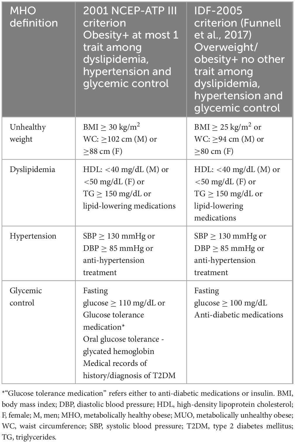 As of today, there is no standardized definition for MHO and more than 30 different criteria have been proposed (Eckel et al., 2016; Gómez-Zorita et al., 2021; Ma et al., 2019; Primeau et al., 2011; Rey-López et al., 2014; Smith et al., 2011). Among the most used criteria in the neuroimaging literature are those proposed by the National Cholesterol Adult Treatment Panel III (NCEP-ATP-III) (Expert Panel on Detection, Evaluation, and Treatment of High Blood Cholesterol in Adults, 2001) and the International Diabetes Federation (IDF) (Mørkedal et al., 2014). The two differ in their definition of both “metabolically healthy” and “obese” within the MHO category: the IDF definition demands the absence of any metabolic disturbance but includes individuals in the overweight range (BMI ≥ 25 kg/m2 and/or WC ≥ 94 cm for men or ≥ 80 cm for women). In contrast, the NCEP-ATP-III criterion is less stringent for metabolic status, allowing individuals to have no more than one metabolic abnormality among dyslipidemia, hypertension and glycemic control, but includes only individuals with overt obesity (BMI ≥ 30 kg/m2 and/or WC: ≥102 cm for men or ≥88 cm for women). They also differ slightly in the definition of impaired glycemic control, as detailed in the following table (Table 2).