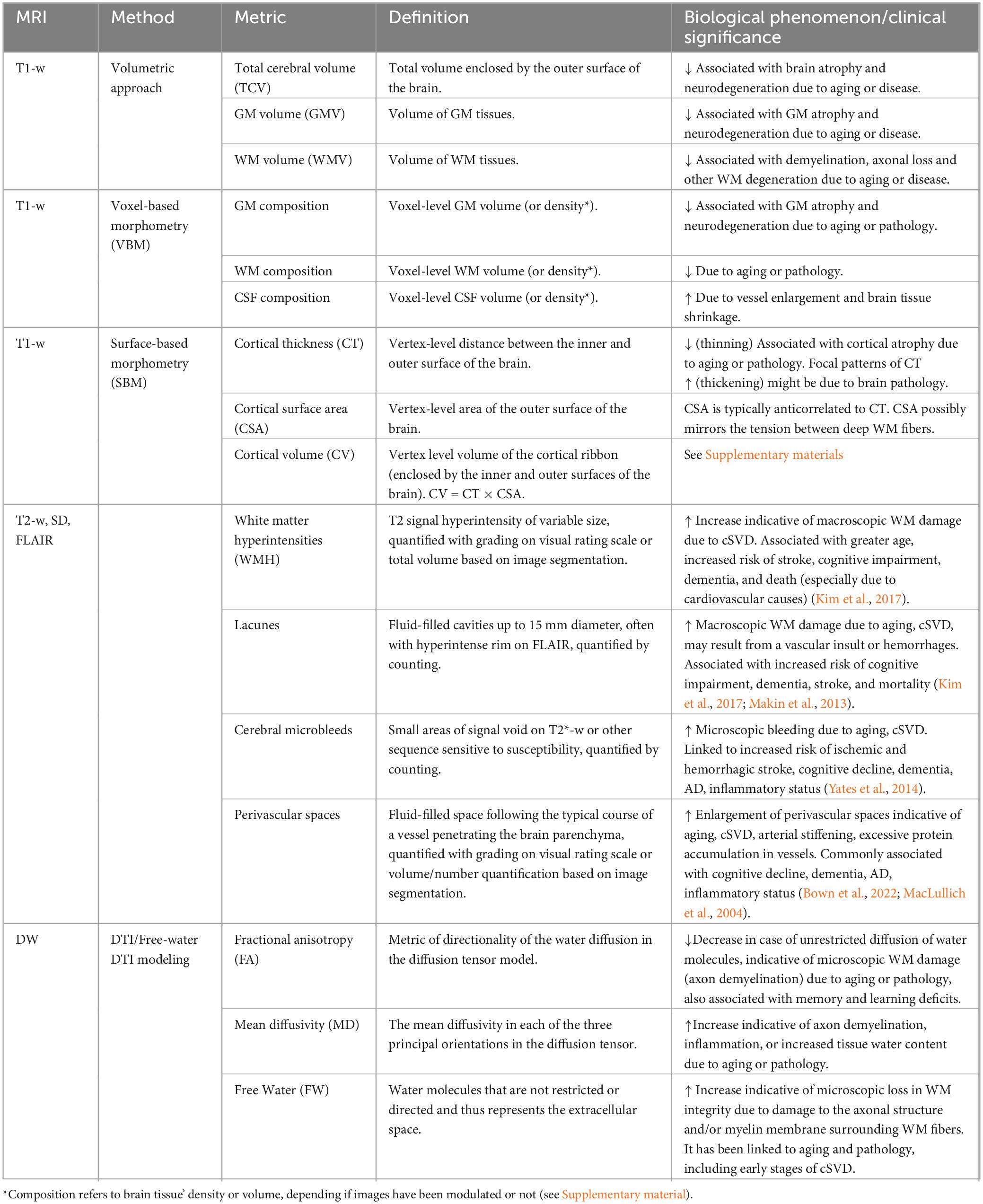 T2-weighted (T2-w), Proton Density-weighted (PD), and Fluid-Attenuated Inversion Recovery (FLAIR) MRI data can be used to detect macroscopic areas of WM pathology associated to aging-related processes and cerebrovascular damage. White Matter Hyperintensities (WMH), lacunes, microbleeds (they require sequences sensitive to susceptibility, typically T2*-w and SWI), and enlarged perivascular spaces are well-established markers of cerebral small vessel disease (cSVD) (Duering et al., 2023). WMH prevalence increases with age, obesity, hypertension, diabetes, but also with unhealthy lifestyles such as smoking and sedentary life (Hakim, 2019; Wardlaw et al., 2015). WMH are clinically relevant as they highlight microvascular lesions in the cerebral white matter, possibly resulting from demyelination and axonal loss, and have been linked with an increased risk of stroke, cognitive impairment, dementias, neurological diseases, and late-onset depression (Debette and Markus, 2010; Herrmann et al., 2007; Kalaria et al., 2012; Lampe et al., 2019; Tosto et al., 2014). Moreover, WMH can be used as an anatomical signature of cognitive decline and dementia (Marseglia et al., 2019). Other cSVD markers have also been previously associated with cognitive impairment, including lacunes (Makin et al., 2013), microbleeds (Cordonnier et al., 2007; Vermeer et al., 2007; Shenton et al., 2012).