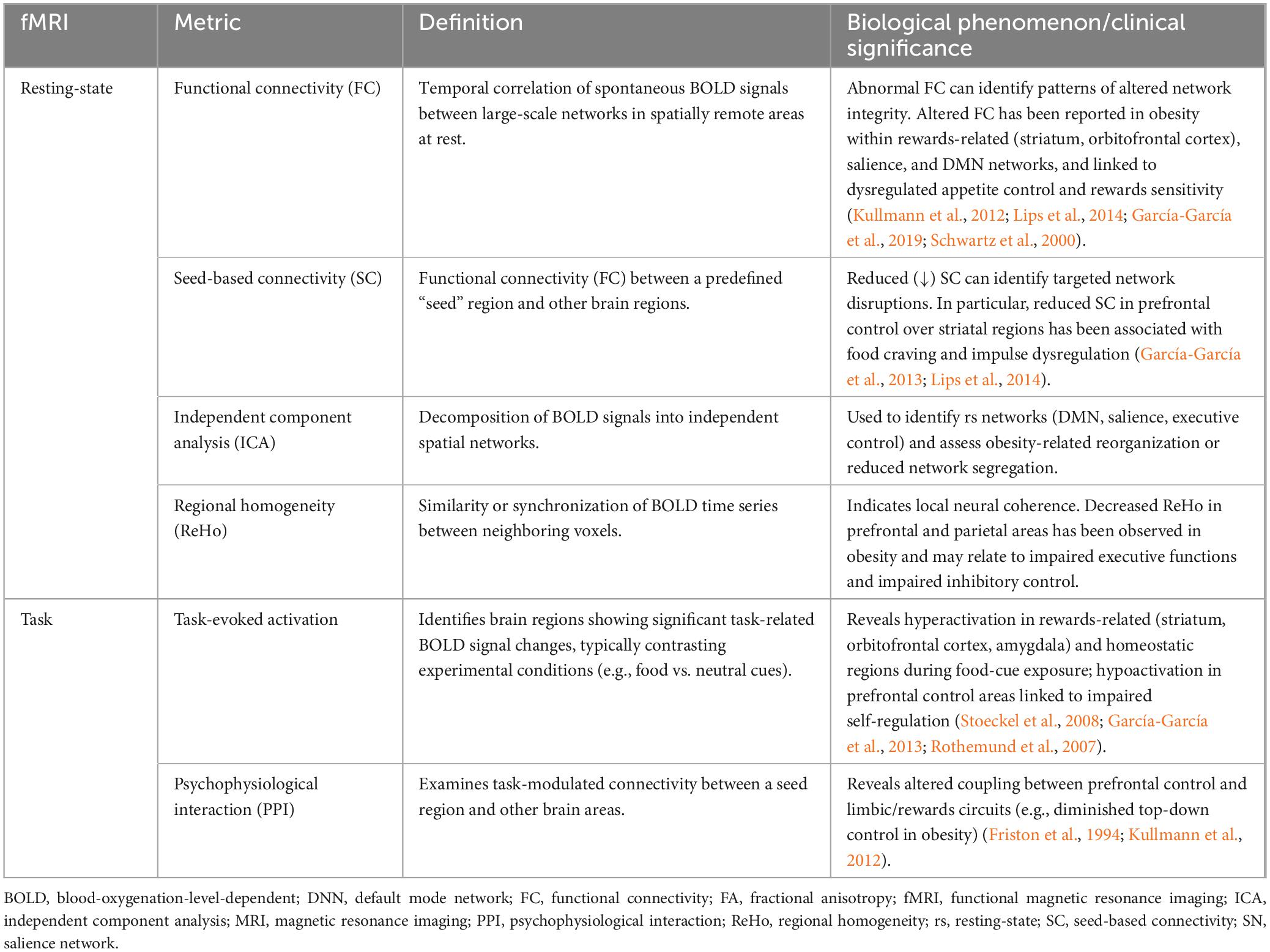 Resting-state functional MRI (rs-fMRI) assess spontaneous neuronal activity by measuring low-frequency (<1 Hz) fluctuations in Blood-Oxygenation-Level-Dependent (BOLD) signals on individuals who are not engaging in a specific task (at rest) (Wang et al., 2025). The rs-fMRI signals measure local changes in cerebral blood flow and oxygenation, which are assumed to reflect the intrinsic functional interaction between brain regions. Among the most used rs-fMRI-based metrics is the Seed-Based Connectivity (SC) which quantifies temporal correlations between predefined regions of interest -typically large-scale networks such as the default mode network (DMN), salience network (SN), and executive control network (ECN)- and the rest of the brain. Abnormalities in SC connectivity are linked to dysregulated self-referential processing and salience attribution, which are relevant for eating behavior. In addition, independent component analysis (ICA) allows for the identification of spatially independent networks, providing insights into intrinsic brain organization without requiring a priori hypotheses. Also, the measures the intensity of spontaneous neural activity in specific brain regions, serving as proxies for regional spontaneous brain activity. Correlation patterns among large-scale networks in spatially remote areas, assessed via Functional Connectivity (FC), have been also used to study the neuronal control of food intake (Lips et al., 2014). Finally, Regional Homogeneity (ReHo) measure assesses local synchronization of BOLD signals, reflecting the functional coherence of neighboring voxels.