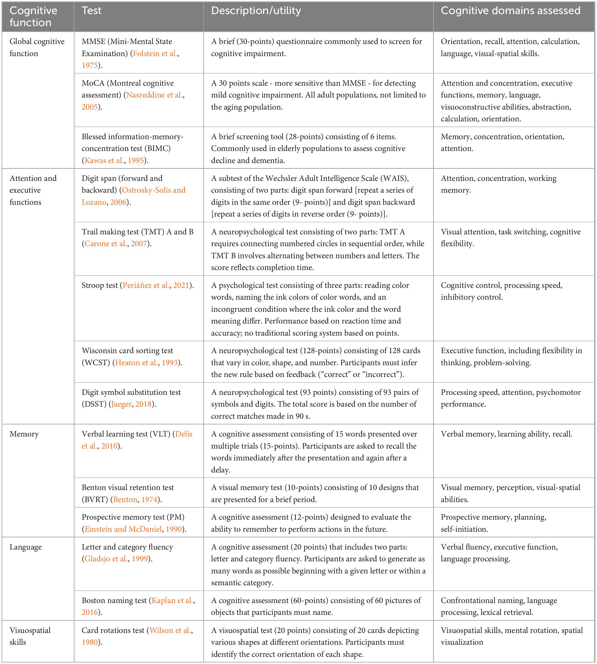 In the context of evaluating cognitive dysfunctions in MHO, a number of neurocognitive tests are typically administered to quantify global cognitive performances and executive functions, particularly in the domains of episodic and working memory, processing speed, attentional control, and response inhibition functions (Gunstad et al., 2007). Executive functions play a crucial role in influencing dietary intake and eating choices – and in turn maintaining equal or negative energy balance –through regulation of impulse control, self-monitoring, and goal-directed behavior (Gonçalves et al., 2014; Gunstad et al., 2007; Wyckoff et al., 2017). A summary of these scales, which are also widely used for monitoring age-related cognitive decline, is provided in Table 5.