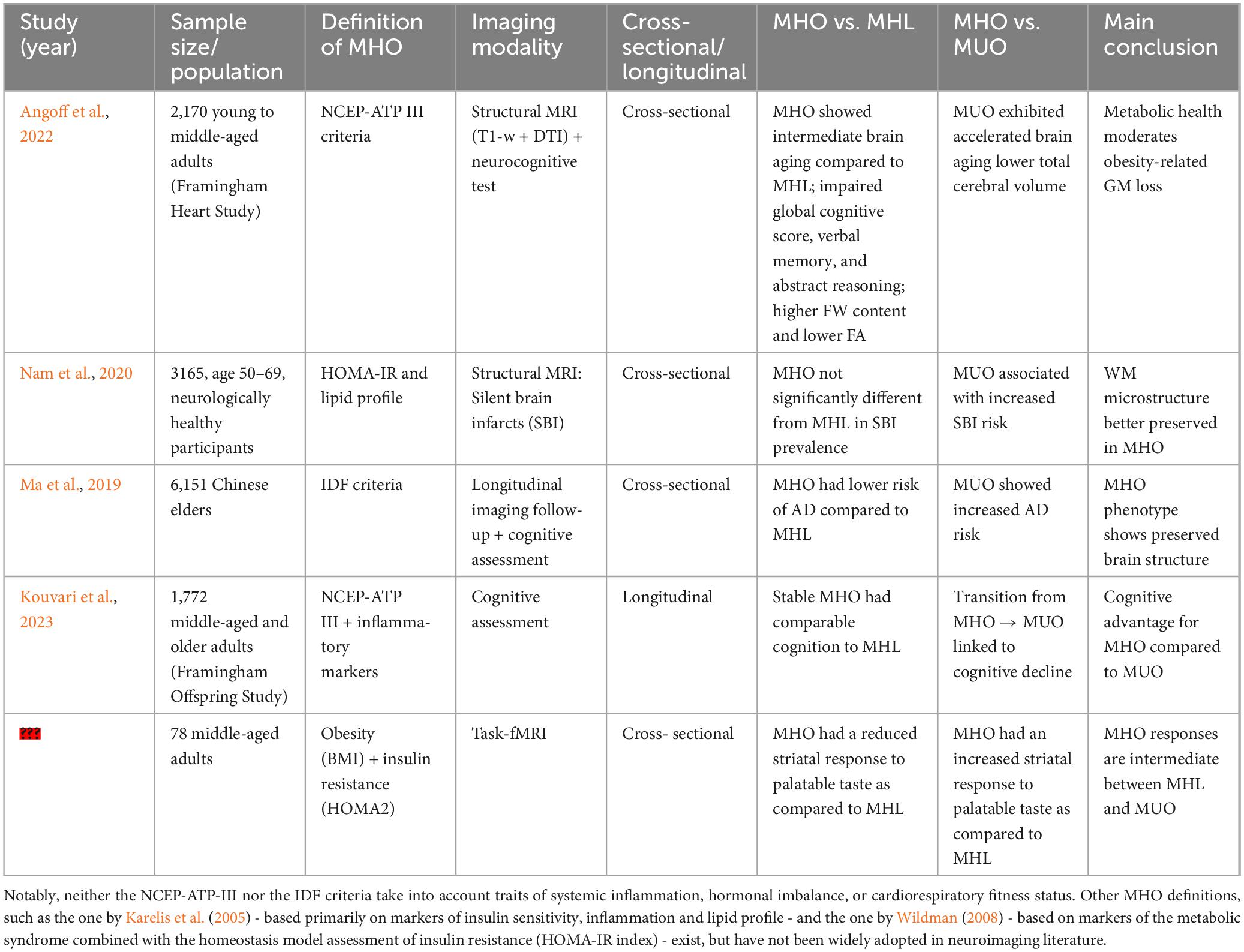 The MRI literature of neuroanatomical changes in metabolically healthy obesity, especially in late adulthood, is relatively scarce, see Table 6. Among the few direct brain MRI studies (Angoff et al., 2022; Nam et al., 2020; Ma et al., 2019), the differences in the definition of MHO and sample selection complicate direct comparisons among studies (García-García et al., 2022; Eckel et al., 2016).