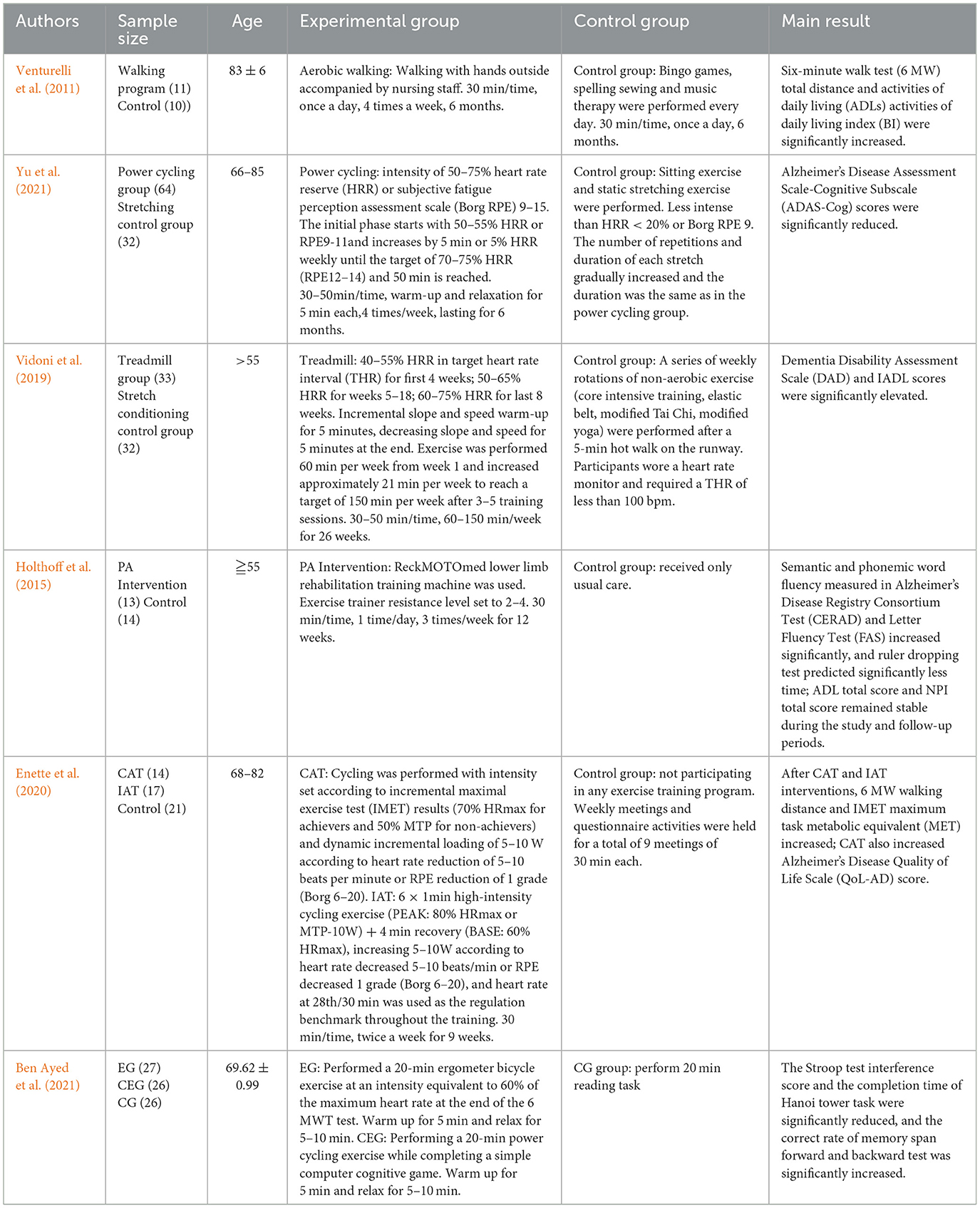 Among various types of exercise programs, aerobic exercise is considered the most potential and cost-effective intervention (Lee et al., 2023). Aerobic exercise such as outdoor aerobic walking (Venturelli et al., 2011), power cycling (Yu et al., 2021), and treadmill training (Vidoni et al., 2019) are widely used as adjuncts to AD drug therapy and have been shown to have direct beneficial effects in improving cognitive function, motor function, and quality of life in AD patients. Aerobic pedal rehabilitation training, based on the fixation device ReckMOTOmed, improves multidimensional cognitive function (including executive control, verbal fluency, response speed, and attention allocation) in AD patients and greatly relieves stress on care in AD patients; follow-up studies have shown that its improvement remains sustained for at least 3 months after termination of the intervention (Holthoff et al., 2015). Comparative studies have found that different aerobic exercise training modes enhance aerobic fitness and physical performance in AD patients, with intermittent aerobic training (IAT) also significantly improving self-care ability in AD patients (Enette et al., 2020). It has also been shown that even a single acute work rate cycling training session significantly improves cognitive dysfunction in patients with moderate AD, and this improvement is enhanced when combined with cognitive play (Ben Ayed et al., 2021). Subsequent studies have shown that there is also no significant gender difference in the benefit of a single acute aerobic exercise in AD patients (Ben Ayed et al., 2024) (as shown in Table 1).