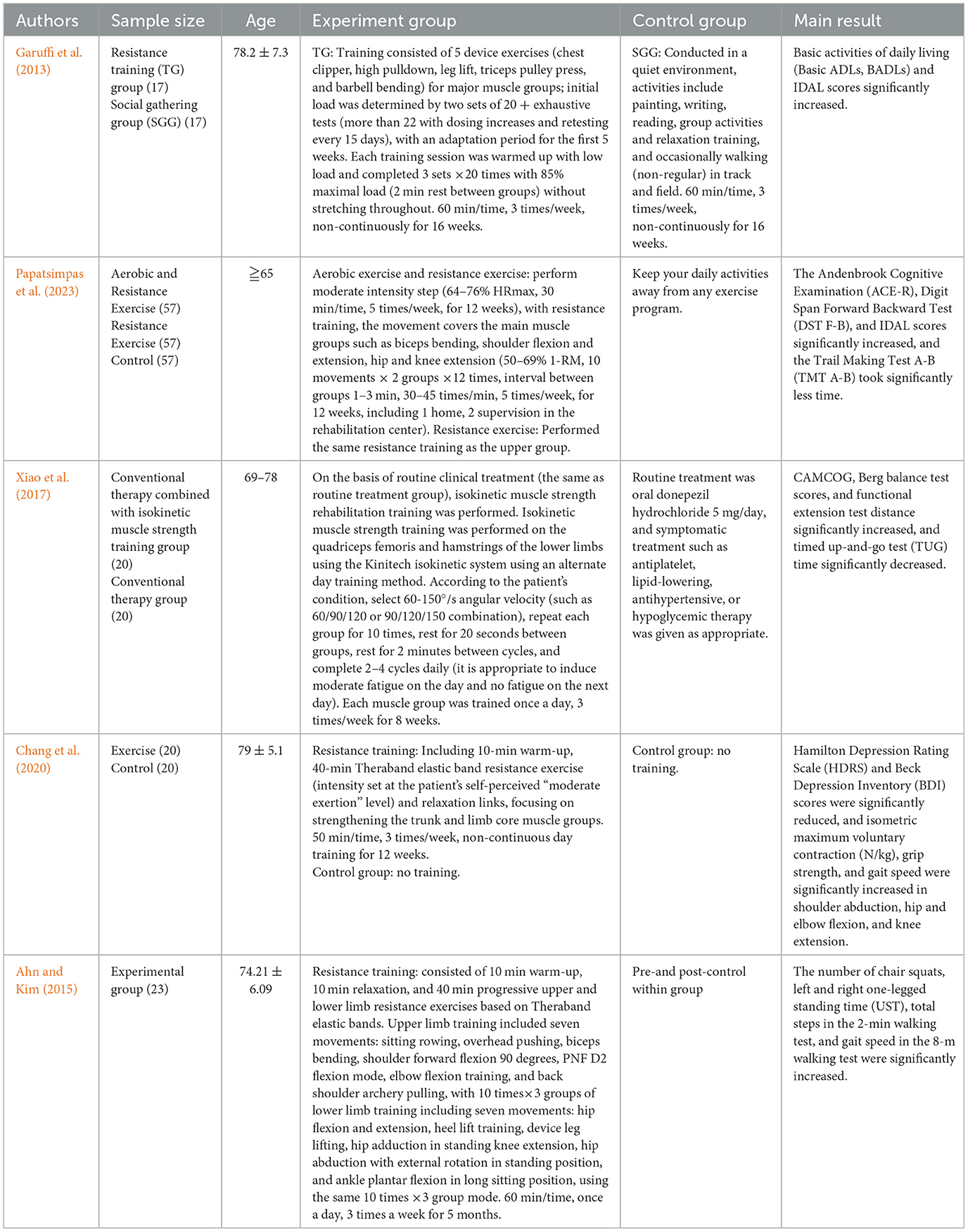Resistance training has been shown to positively impact agility, lower limb strength, balance, and flexibility in AD (Garuffi et al., 2013). Papatsimpas et al. demonstrated that resistance training was effective in slowing global cognitive function, executive function, and working memory decline and improving instrumental daily activity in patients with mild AD; the effect was more significant if combined with aerobic exercise (Papatsimpas et al., 2023). Xiao et al. showed that isokinetic muscle strength training can not only significantly promote the recovery of cognitive function and activities of daily living in AD patients, but also significantly improve motor function and balance function, and advocated that isokinetic muscle strength training should be used as an adjuvant therapy for the treatment of AD patients (Xiao et al., 2017). Chang et al. showed that resistance training targeting the trunk and lower limbs resulted in significant improvements in depression, muscle mass, and muscle function in patients with mild AD-sarcopenia comorbidity (Chang et al., 2020). Resistance training of the upper and lower extremities based on elastic bands has also been shown to significantly improve muscle strength and endurance, cardiopulmonary function, and gait speed in patients with mild AD, and resistance training is considered an effective rehabilitation program for patients with AD (Ahn and Kim, 2015). Other studies have also shown that resistance training does not significantly improve cognitive function in AD patients. The reason for the lack of expected results may be that the low-volume, low-intensity exercise program adopted under the principle of safety first failed to fully activate the neural adaptive mechanism (Vital et al., 2012). Based on the multifaceted improvement of AD patients by resistance training with different intensity and cycle parameters mentioned above (including cognitive function, motor function, muscle strength, functional flexibility, and quality of life), it should be considered as an important component of AD public health promotion programs (as shown in Table 2).