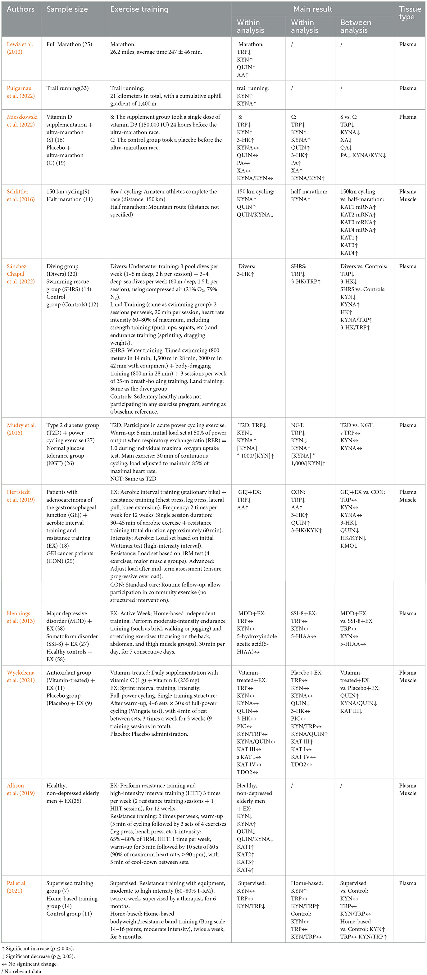 A large number of studies have reported that exercise activates peripheral KP, and both acute (single) exercise and long-term (multi-week structured training) exercise significantly alter peripheral KP-related metabolite levels. Acute exercise such as full marathon (Lewis et al., 2010) resulted in a significant decrease in plasma TRP and a significant increase in KYN; plasma KYN was effectively converted to KYNA after cross-country running (Puigarnau et al., 2022), super marathon (Mieszkowski et al., 2022), and 150 km bicycle timer (Schlittler et al., 2016), as shown by an increase in KYNA/KYN ratio. Chronic exercise, on the other hand, similarly activates peripheral KPs, thereby increasing the propensity of KP metabolites to KYNA branching, possibly due to elevated expression levels and activity of KATs. Chronic exercise such as 72 weeks of diving training and swimming training decreased TRP content and increased KYNA content in peripheral blood (Sánchez Chapul et al., 2022). Studies have shown that the results of acute and chronic exercise on peripheral KP metabolites in clinically ill people are consistent with those in healthy people. Mudry et al. showed that a significant increase in serum KYNA concentration, a significant decrease in KYN concentration, and a significant decrease in serum TRP concentration at 3 h after recovery were observed in male patients with type 2 diabetes after performing acute aerobic exercise and a significant increase in the [KYNA] 1,000/[KYN] ratio (Mudry et al., 2016). Herrstedt et al. showed that 12 weeks of aerobic exercise and systemic resistance exercise decreased serum 3-HK concentrations in patients with gastroesophageal junction adenocarcinoma; a trend toward increased serum KYNA concentrations was found after 60 min of a single exercise (Herrstedt et al., 2019). However, not all studies have shown positive benefits of exercise for KP. Hennings et al. showed that 1 week of physical activity only significantly reduced KYN content in patients with major depression, while KP metabolites did not change significantly in the serum of patients with somatoform syndrome (Hennings et al., 2013). The emergence of such differential results suggests that the effect of exercise on KP may depend on the mode, intensity, duration of exercise, and the specific disease context of the subject, and future studies are needed to further dissect these variables. The effects of exercise on peripheral KP-related metabolic enzyme activity and expression levels have been reported in healthy organisms and different disease states. Wyckelsma et al. showed that 3-week sprint interval training increased KATIII expression levels in skeletal muscle by about 50% in healthy older men compared with controls (Wyckelsma et al., 2021). Allison et al. showed that 12 weeks of combined (systemic resistance + high-intensity interval training) exercise (significantly up-regulated KAT I–KAT IV expression levels in skeletal muscle of healthy elderly men (Allison et al., 2019). Pal et al. showed that 72 weeks of device-based progressive resistance could indirectly decrease the KYN/TRP ratio, an indicator of IDO/TDO enzyme activity, in peripheral serum of pancreatic cancer patients (Pal et al., 2021) (as shown in Table 4). These findings together suggest that different types of long-term exercise can significantly up-regulate KATs expression levels in skeletal muscle of healthy people or decrease IDO/TDO activity indicators in the periphery of diseased people, skewing KP-prone neuroprotective branches.