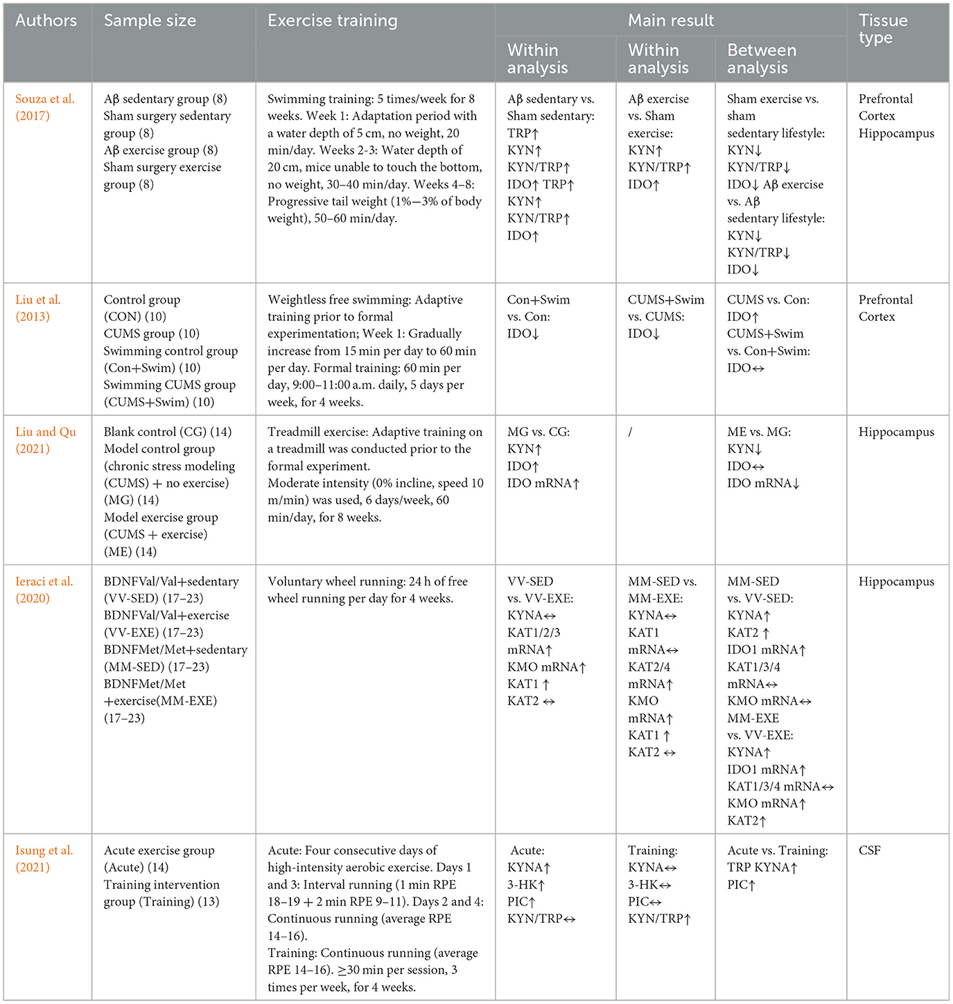 Isung, J., Granqvist, M., Trepci, A., Huang, J., Schwieler, L., Kierkegaard, M., et al. (2021). Differential effects on blood and cerebrospinal fluid immune protein markers and kynurenine pathway metabolites from aerobic physical exercise in healthy subjects. Sci. Rep. 11:1669. doi: 10.1038/s41598-021-81306-4