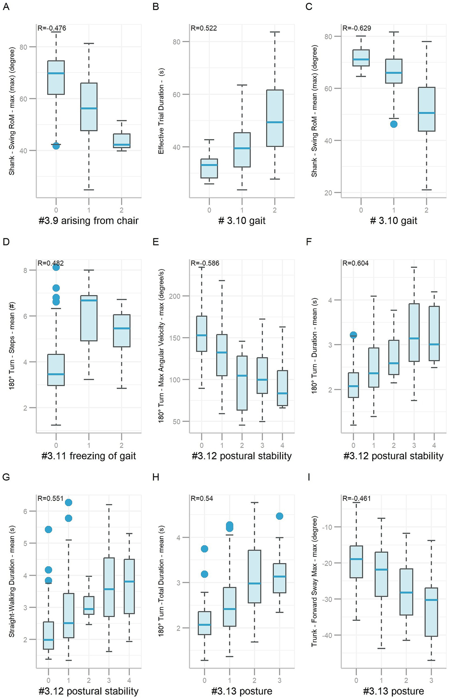 XGBoost was chosen as the final model due to its better performance than SVM. Across all five gait and posture items, the models achieved over 80% acceptable accuracy. For items #3.9–#3.11, absolute accuracy surpassed 70%, and macro-F1 scores were above 0.60 in leave-one-out cross-validation (LOOCV). The model’s performance on the independent test set matched LOOCV results, confirming robustness. A total of 35, 35, 30, 30, and 40 gait features were selected for the predictive models of items #3.9–#3.13, respectively. Among these, key features with significant clinical relevance were identified. For example, Effective Trial Duration (R = 0.522, p < 0.001) had a positive correlation, while Shank—Swing RoM—mean (max) (R = −0.629, p < 0.001) had a negative correlation with scores on item #3.10. In addition, 180° Turn—Steps – mean (R = 0.482, p < 0.001) had a positive correlation with scores on item #3.11. These findings align with known clinical manifestations, reinforcing the clinical relevance of the identified gait features.
