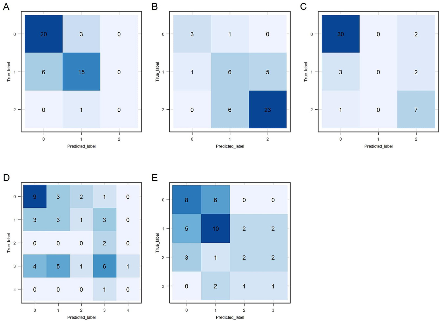 Predictive performance comparisons between XGBoost and SVM algorithms for each of the five gait and posture items based on LOOCV are presented in Table 2. XGBoost consistently demonstrated better performance compared to SVM; therefore, XGBoost was selected as the final predictive model for all five gait and posture items. Weighted F1 score of item #3.9 ~ #3.11 is above 0.7, while they are approximately 0.6 for item #3.12 and #3.13. Macro-F1 score of item #3.9 ~ #3.11 is above 0.6, while they are approximately 0.5 for item #3.12 and #3.13. Absolute accuracy of all five XGBoost models exceeded 55%, with items #3.9, #3.10, and #3.11 achieving values above 70%. Acceptable accuracy (within ±1 point of true scores) exceeded 80% for all models, with notably high accuracy (>90%) observed for items #3.9, and #3.10. Kw coefficients, indicating the level of agreement between true and predicted scores, were above 0.5, representing at least moderate agreement for all five models. Detailed precision, recall, and F1 values for each gait and posture item classification by XGBoost models are shown in Table 3. Overall, precision and recall varied across score categories and items, with lower score categories (indicating less severe impairment) generally showing higher classification performance, while higher score categories, particularly those with limited sample sizes, exhibited reduced performance. For item # 3.9, the model achieved strong classification performance for the unimpaired category (Score 0), with LOOCV precision, recall, and F1 score of 0.855, 0.803, and 0.828, respectively. While performance for higher severity categories showed room for improvement, these categories were notably underrepresented (e.g., only 7 samples for Score 2/3/4 in LOOCV), which likely contributed to reduced model performance in those groups. In item # 3.10, the model demonstrated good performance for Score 2/3 with a precision of 0.916 and recall of 0.784 under LOOCV, while classification for Score 0 showed lower performance, with an F1 score of 0.48. The model also demonstrated robust performance for item # 3.11, achieving an F1 score of 0.889 for the non-impaired group (Score 0) and 0.627 for higher severity categories (Score 2/3/4) under LOOCV, suggesting reliable detection of both absence and presence of freezing phenomena, despite limited data for intermediate severity levels. Performance for items # 3.12 and # 3.13 followed similar trends, with higher classification metrics for lower severity categories and reduced performance for higher scores, primarily attributable to class imbalance and the small number of samples representing more severe symptoms. Confusion matrices for the training datasets of the final XGBoost model are presented in Figure 4.