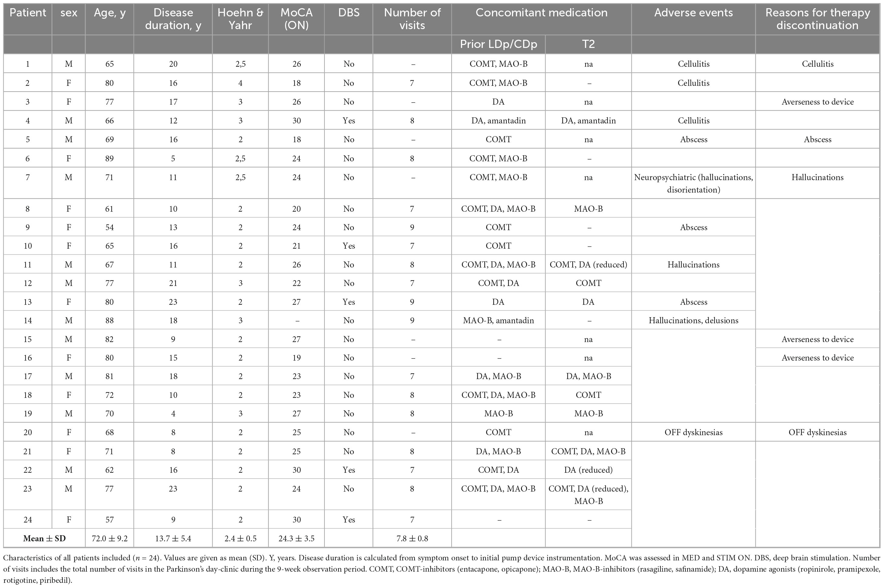 In this study, we evaluated the implementation of subcutaneous LDp/CDp treatment in patients with aPD in the therapeutic setting of the Hamburg Parkinson’s day-clinic (HPDC) (Fründt et al., 2018).