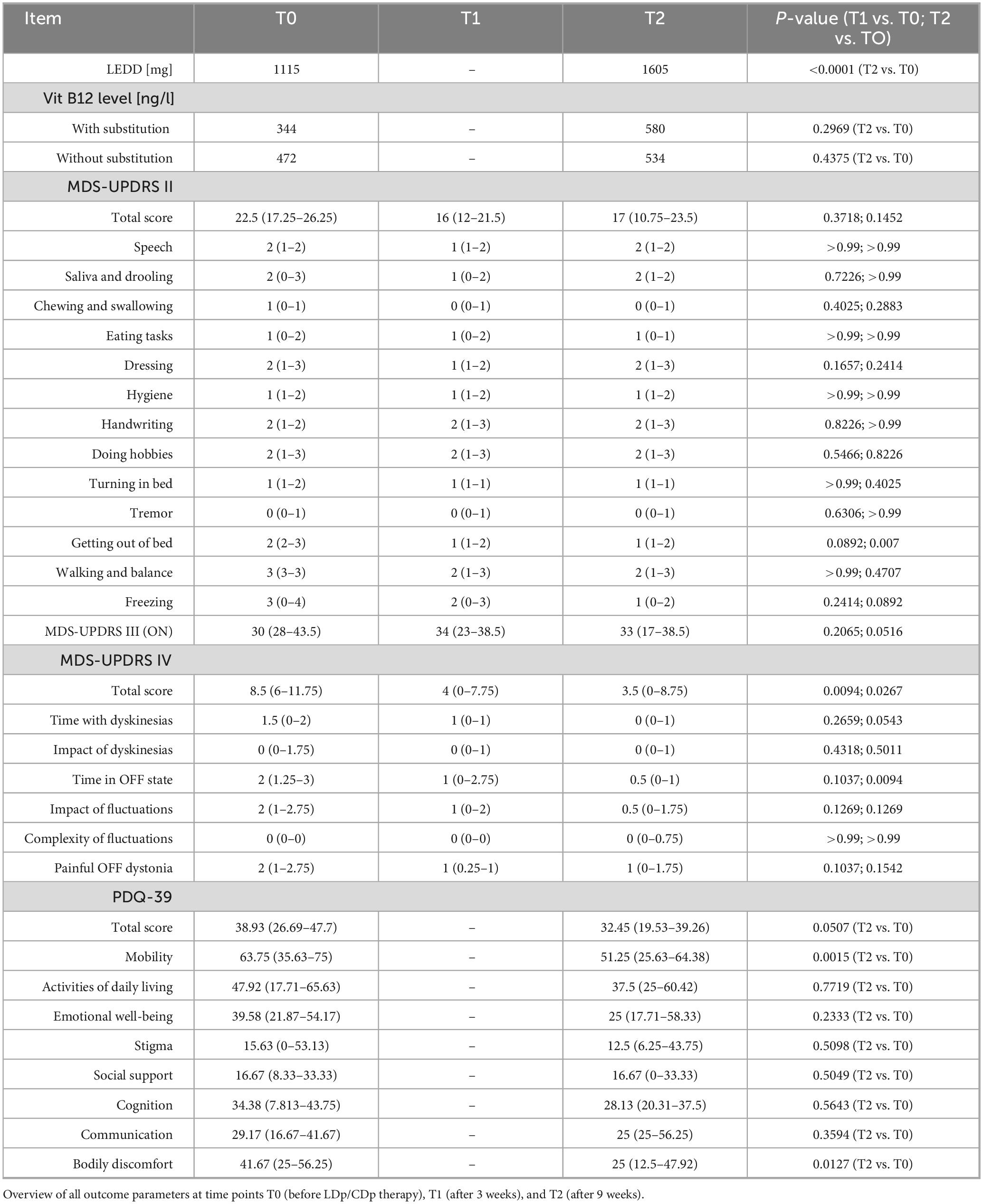 As outcome parameters we included the routinely assessed outcome parameters Unified Parkinson’s Disease Ranking Scale (MDS-UPDRS) part II, III (measured in the ON-state but not based on a formal Levodopa challenge test) and IV (Goetz et al., 2008) reflecting the patient’s motor experiences of daily living (II), the clinical motor examination (III) and motor complications (IV). The MDS-UPDRS IV reflects (i) the waking time spent with dyskinesias, (ii) the functional impact of dyskinesias, (iii) painful off state dystonia, (iv) the time spent in the off state, (v) the functional impact of fluctuations and (vi) complexity of motor fluctuations. The Parkinson’s Disease Questionnaire (PDQ-39) was used for the assessment of quality of life (Jenkinson et al., 1997). All scores and questionnaires were collected before the start of pump therapy (T0), after 3 weeks (T1) and after a total of 9 weeks (T2). All scores were recorded in the clinical ON-state. Patients who did not or incompletely filled out the questionnaires were excluded from pairwise comparative analyses (MDS-UPDRS II: n = 3 at T1, n = 1 at T2, MDS-UPDRS IV: n = 1 at T1, PDQ-39: n = 2 at T1, n = 1 at T2). Furthermore, we assessed the dynamics of levodopa equivalent daily dosage (LEDD) and vitamin B blood levels and evaluated adverse effects, their treatment and therapy discontinuation rates.