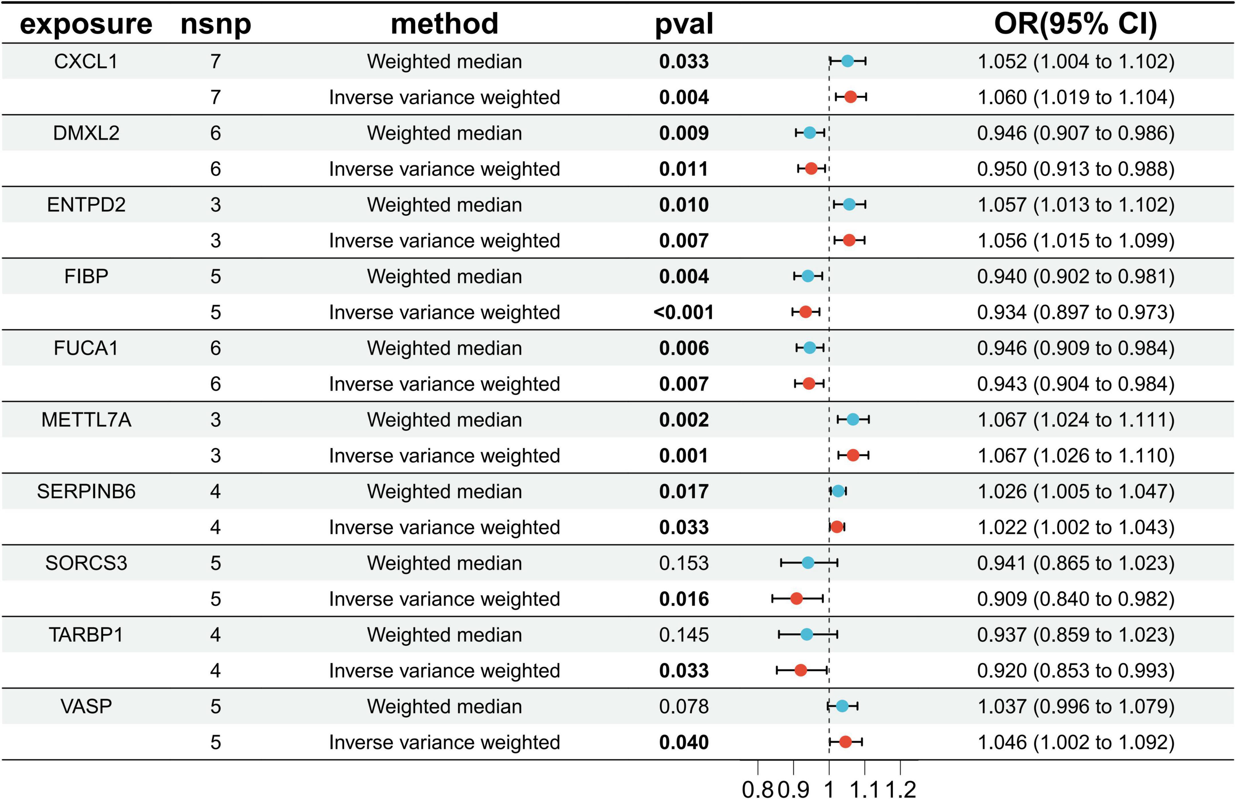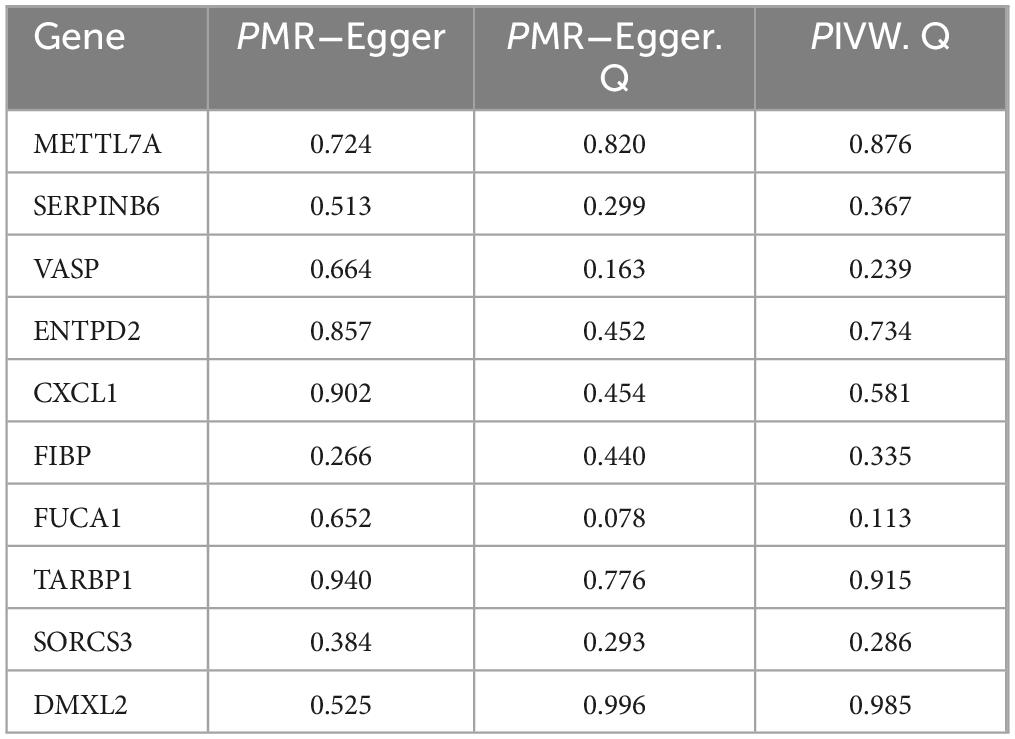 Through cross-tabulation analysis, we identified co-expressed genes from the intersection of related genes and differentially expressed genes, comprising five up-regulated genes (METTL7A, SERPINB6, VASP, ENTPD2, and CXCL1) and five down-regulated genes (FIBP, FUCA1, TARBP1, SORCS3, and DMXL2), as illustrated in Figures 3A, B. To further characterize the chromosomal localization of these genes, we generated a visualization of the co-expressed gene distribution across the genome (Figure 3C). Subsequently, we conducted a MR analysis on the 10 genes co-expressed with AD to evaluate the causal effects of each gene on the disease. The results indicated that all five upregulated co-expressed genes exhibited a significant positive causal association with AD in the MR analysis using the inverse-variance weighting method. Specifically, five upregulated co-expressed genes exhibited significant positive associations with Alzheimer’s disease: METTL7A (OR = 1.067; 95% CI: 1.026–1.110; P = 0.001), SERPINB6 (OR = 1.022; 95% CI: 1.002–1.043; P = 0.033), VASP (OR = 1.046; 95% CI: 1.002–1.092; P = 0.040), ENTPD2 (OR = 1.015; 95% CI: 1.015–1.099; P = 0.007), and CXCL1 (OR = 1.060; 95% CI: 1.019–1.104; P = 0.004). Conversely, all five downregulated co-expressed genes showed significant negative causal associations with the disease: FIBP (OR = 0.934; 95% CI: 0.897–0.973; P = 0.001), FUCA1 (OR = 0.943; 95% CI: 0.904–0.984; P = 0.007), TARBP1 (OR = 0.920; 95% CI: 0.853–0.993; P = 0.033), SORCS3 (OR = 0.909; 95% CI: 0.840–0.982; P = 0.016), and DMXL2 (OR = 0.950; 95% CI: 0.913–0.988; P = 0.011). Beyond the MR-Egger approach, additional validation analyses were conducted employing simple mode, weighted median, and weighted mode methodologies. For the five upregulated genes, all analytical methods consistently revealed an elevated risk of Alzheimer’s disease, as evidenced by odds ratios (ORs) greater than 1. Conversely, across all applied methods, the five downregulated genes consistently indicated a reduced risk of Alzheimer’s disease, with ORs consistently below 1 (Figure 4). The heterogeneity and pleiotropy tests for co-expressed genes yielded non-significant results (all P-values > 0.05), indicating no statistical evidence of heterogeneity or pleiotropic effects that would necessitate adjustment for these biases. Results from the leave-one-out sensitivity analysis demonstrated consistency between the effect estimates when each instrumental variable was excluded individually and the overall combined effect size, confirming the robustness of the analytical framework.