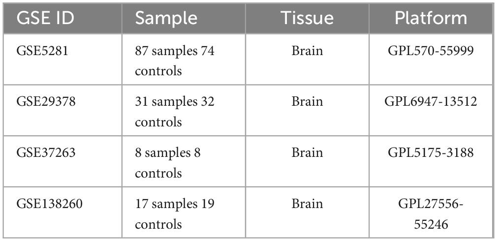 Using R software (version 4.3.2), we performed dataset-specific preprocessing for GSE5281, GSE29378, GSE37263, and GSE138260, which involved data reading and initial normalization using gene expression matrices and annotation files downloaded from the GEO database. After individual preprocessing, the datasets were merged to combine 134 normal samples and 142 Alzheimer’s disease (AD) samples, followed by batch effect correction and variance-stabilizing transformation. Differential gene screening was conducted using the “limma” package with empirical Bayesian analysis, applying significance thresholds of P < 0.05 and absolute log2 fold change (logFC) > 0.585 (Yang et al., 2020). The “pheatmap” package was utilized to generate visualizations, including volcano plots for differential expression analysis and heatmaps for clustering patterns of significant genes. Principal component analysis (PCA) was performed via the “prcomp” function to evaluate sample clustering, assess batch effect mitigation, and visualize key gene expression signatures distinguishing AD cases from healthy controls (Li et al., 2019; Vacchio et al., 2019). This integrated analytical pipeline ensured robust data normalization, rigorous statistical testing, and comprehensive visualization of molecular markers associated with Alzheimer’s disease.