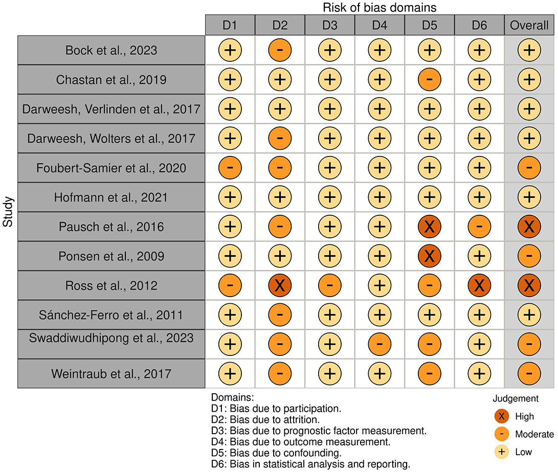 Risk of bias assessment table for various studies, listing domains D1 to D6 and the overall judgement. Symbols indicate the level of bias: a plus sign for low, a minus sign for moderate, and an X sign for high. Each row corresponds to a study, showing its evaluation in each domain and the overall judgement. A key explains the symbols: D1 is bias due to participation; D2, bias due to attrition; D3, bias due to prognostic factor measurement; D4, bias due to outcome measurement; D5, bias due to confounding; and D6, bias due to statistical analysis and reporting.