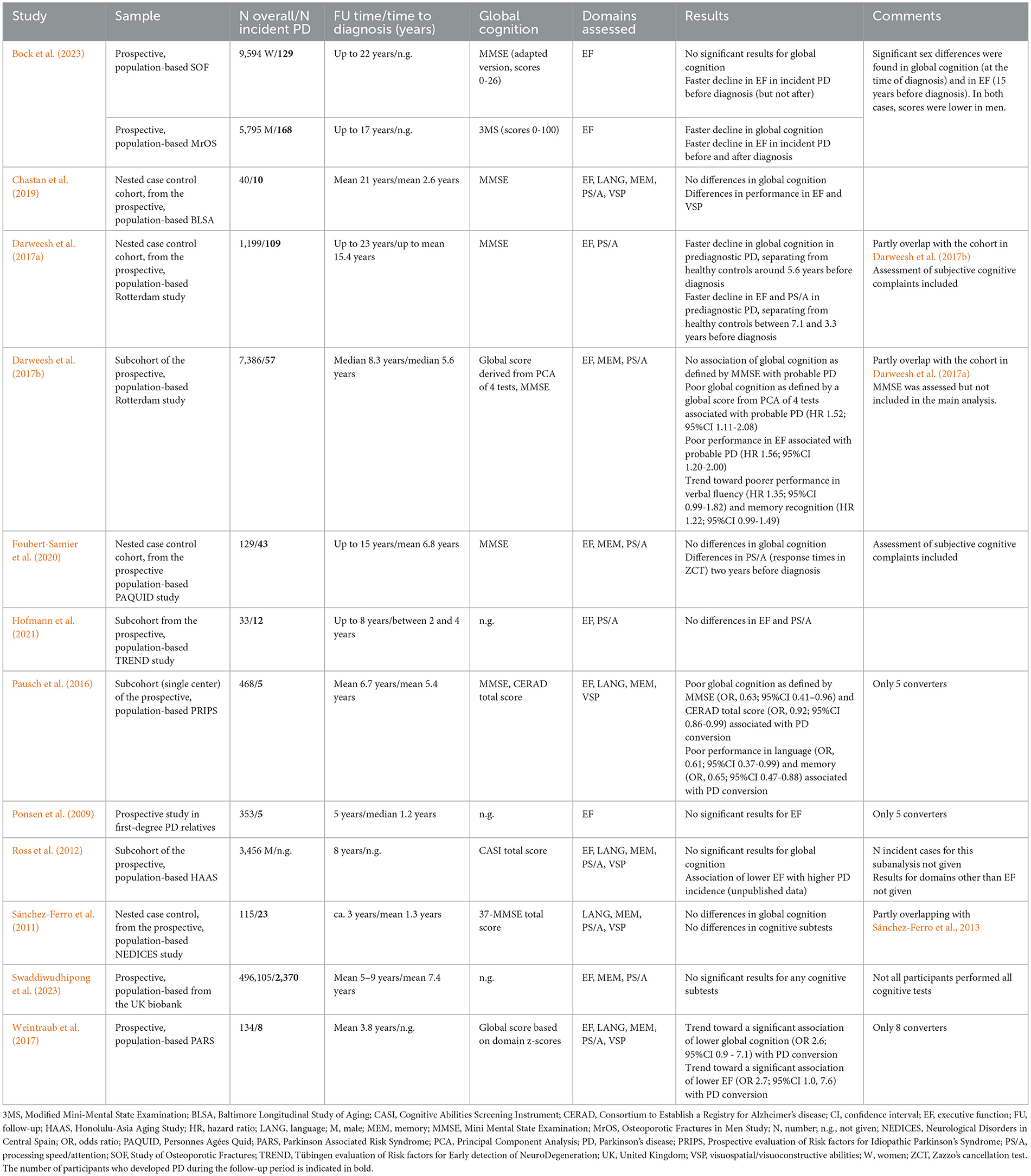 Sample sizes ranged from 33 to 496,105 participants, with a total of 2,939 individuals developing PD. Global cognition was evaluated in nine studies (Foubert-Samier et al., 2020; Darweesh et al., 2017a,b; Weintraub et al., 2017; Chastan et al., 2019; Pausch et al., 2016; Bock et al., 2023; Ross et al., 2012; Sánchez-Ferro et al., 2011). Across the 12 studies, various cognitive domains were assessed: executive function (reported in 11 studies; Foubert-Samier et al., 2020; Darweesh et al., 2017a,b; Weintraub et al., 2017; Chastan et al., 2019; Pausch et al., 2016; Hofmann et al., 2021; Bock et al., 2023; Ponsen et al., 2009; Ross et al., 2012; Swaddiwudhipong et al., 2023), memory (eight studies; Foubert-Samier et al., 2020; Weintraub et al., 2017; Chastan et al., 2019; Darweesh et al., 2017b; Pausch et al., 2016; Ross et al., 2012; Swaddiwudhipong et al., 2023; Sánchez-Ferro et al., 2011), processing speed and attention (nine studies; Foubert-Samier et al., 2020; Darweesh et al., 2017a,b; Weintraub et al., 2017; Chastan et al., 2019; Hofmann et al., 2021; Ross et al., 2012; Swaddiwudhipong et al., 2023; Sánchez-Ferro et al., 2011), visuospatial and visuoconstructive abilities (five studies; Weintraub et al., 2017; Chastan et al., 2019; Pausch et al., 2016; Ross et al., 2012; Sánchez-Ferro et al., 2011), and language (five studies; Weintraub et al., 2017; Chastan et al., 2019; Pausch et al., 2016; Ross et al., 2012; Sánchez-Ferro et al., 2011). The specific cognitive tests employed were highly heterogeneous; detailed descriptions are provided in Table 2. Below, we summarize the main findings, focusing on those studies reporting significant changes associated with incident PD. Supplementary Table 1 reports a list of the reviewed studies, highlighting the cognitive domains in which significant results were found.