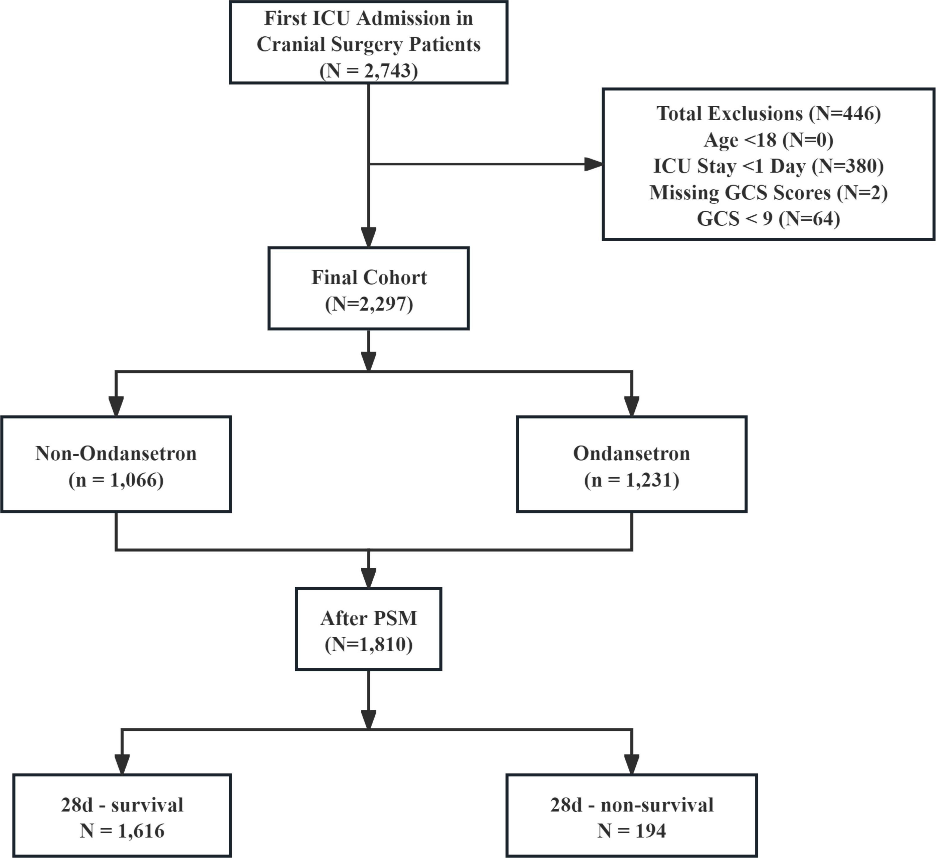 Flowchart showing patient selection and outcomes in a study of cranial surgery patients admitted to ICU. From 2,743 initial patients, 446 were excluded. The final cohort of 2,297 was divided into those who did not receive ondansetron (1,066) and those who did (1,231). After propensity score matching, 1,810 remained, resulting in 1,616 surviving and 194 not surviving after 28 days.