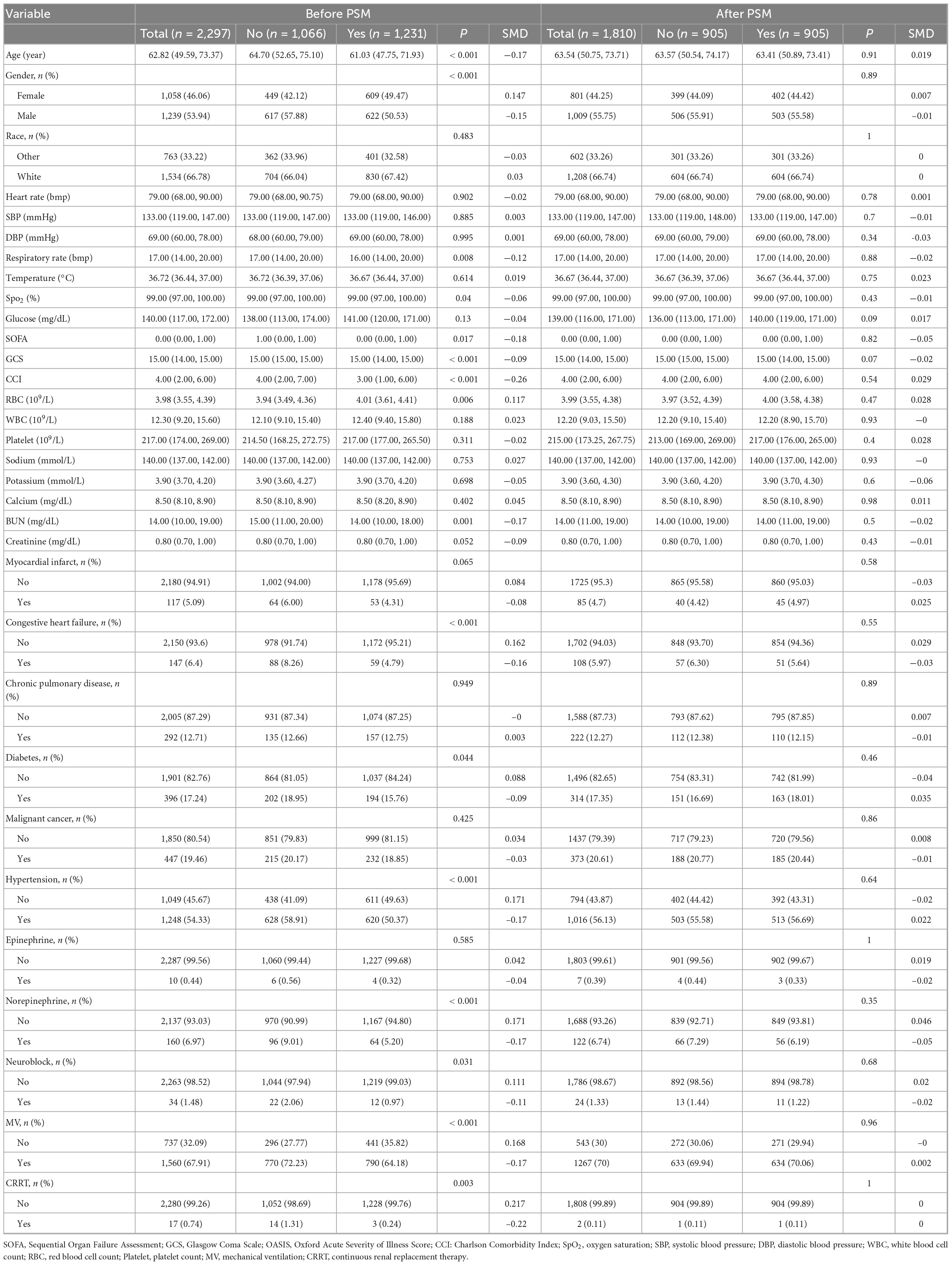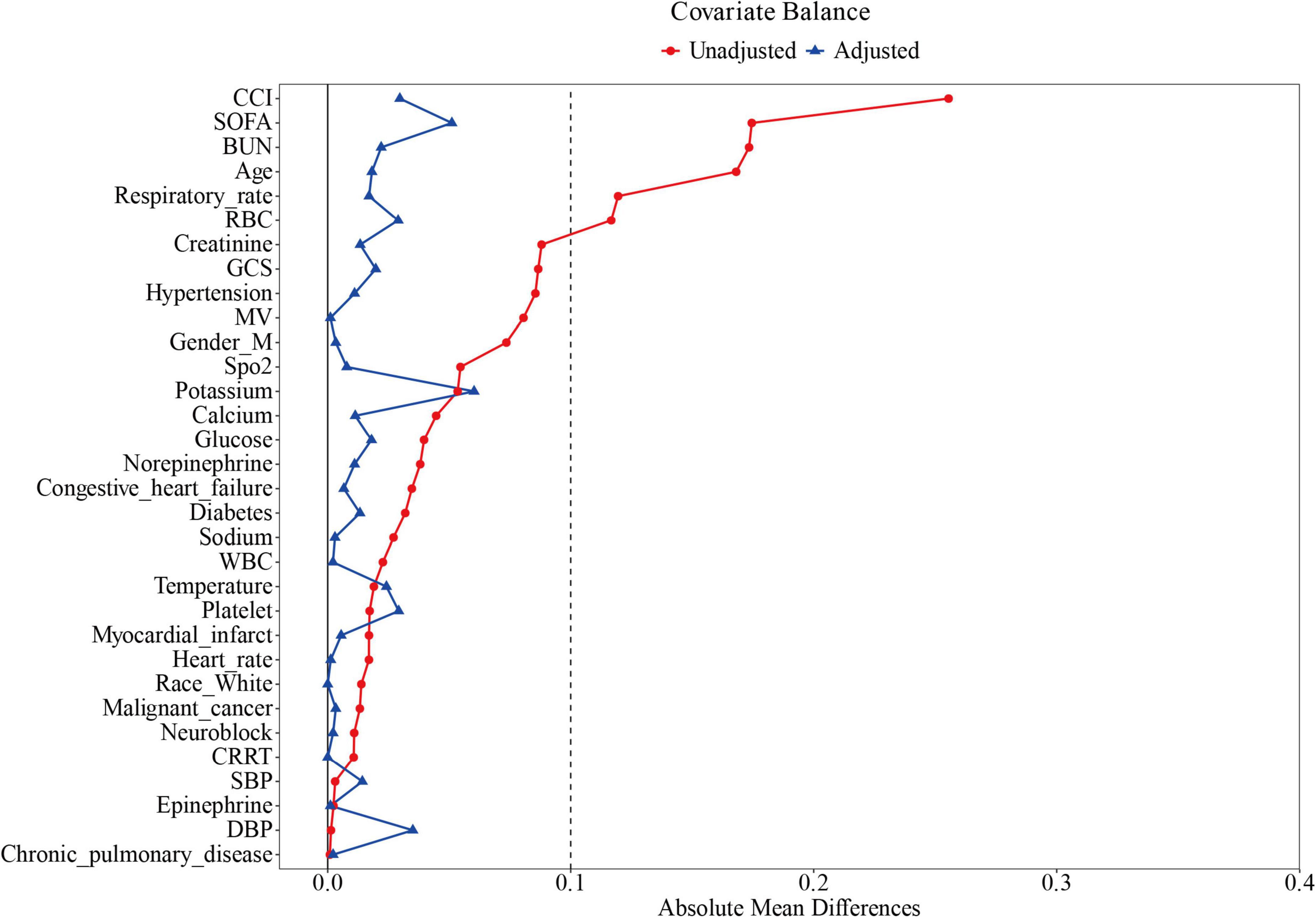 Figure 2. Standardized mean difference of variables before and after propensity score matching. SOFA, Sequential Organ Failure Assessment; GCS, Glasgow Coma Scale; CCI, Charlson Comorbidity Index; MV, mechanical ventilation; CRRT, continuous renal replacement therapy; WBC, white blood cells; SpO2, blood oxygen saturation; SBP, systolic blood pressure; DBP, diastolic blood pressure.