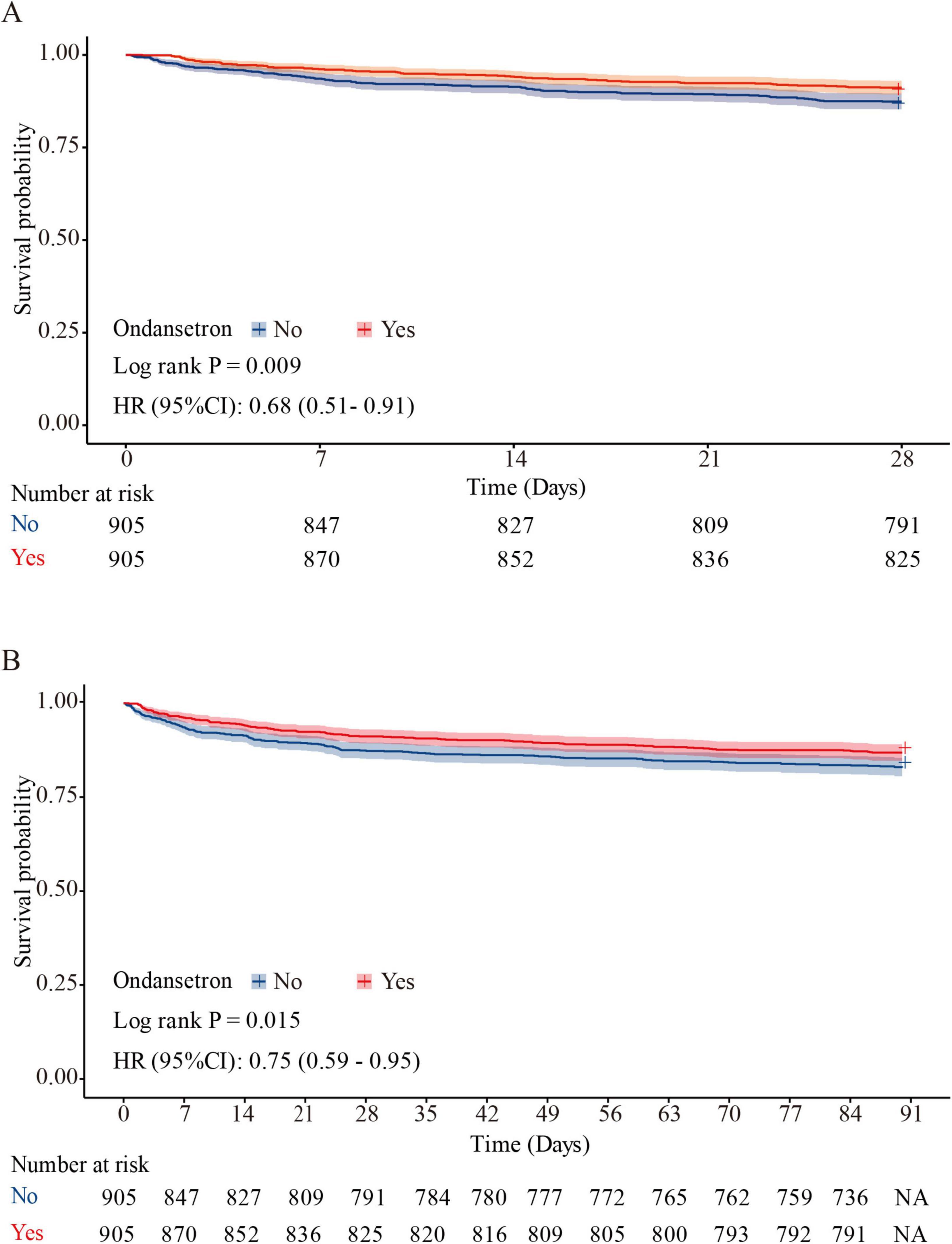Figure 3. Kaplan–Meier survival curve for 28 and 90 days mortality. Ondansetron use was associated with improved 28 days survival (HR = 0.68, 95% CI: 0.51–0.91; log-rank P = 0.009) (A), and 90 days survival (HR = 0.75, 95% CI: 0.59–0.95; P = 0.015) (B) in the matched cohort.