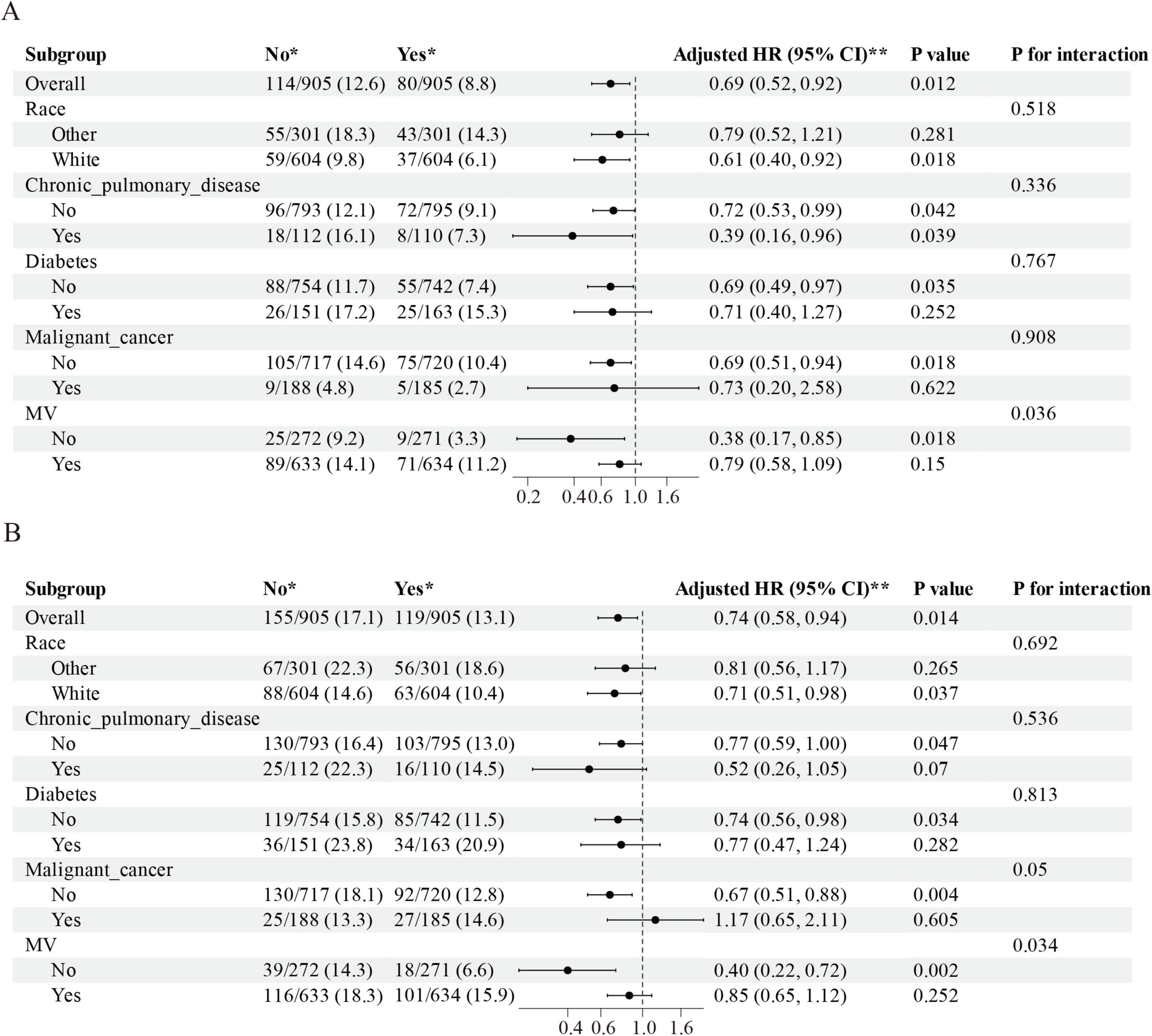 Forest plots A and B illustrate the adjusted hazard ratios (HR) with 95% confidence intervals (CI) for various subgroups, including race, chronic pulmonary disease, diabetes, malignant cancer, and mechanical ventilation (MV). Each subgroup shows the comparison between “No” and “Yes” categories. The plots display HRs, P values, and P values for interaction, indicating statistical significance in some comparisons, such as “Overall,” “Race: White,” and “MV.”