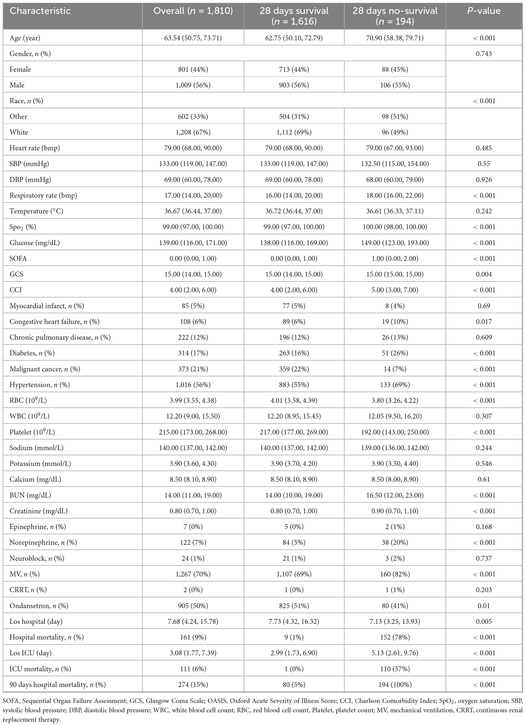 Analysis of the propensity-matched cohort (n = 1,810) identified statistically significant associations between 28 days mortality and multiple covariates (P < 0.05), including demographic characteristics (age, ethnicity), physiological metrics (respiratory rate, SpO2, glucose levels), clinical severity scores (SOFA, GCS, and CCI), comorbidities (congestive heart failure, diabetes mellitus, malignancy, hypertension), hematologic parameters (RBC and platelet count, BUN, creatinine), therapeutic interventions (norepinephrine, ondansetron and MV) (Table 2). Potential prognostic variables underwent univariate Cox proportional hazards screening (Supplementary Table 2) to identify candidate predictors of postoperative prognosis.