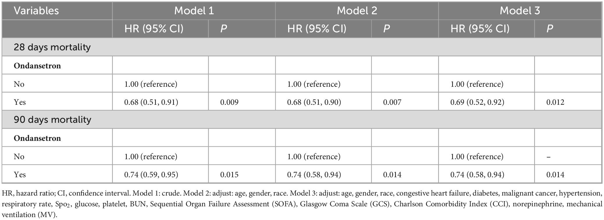 Methods: Utilizing a retrospective cohort design, we analyzed data from 2,297 eligible patients, segregating them into ondansetron-treated and control groups, while applying propensity score matching to harmonize baseline characteristics. The primary outcomes assessed were 28-day and 90-day mortality, evaluated using multivariable Cox regression and Kaplan-Meier analysis.