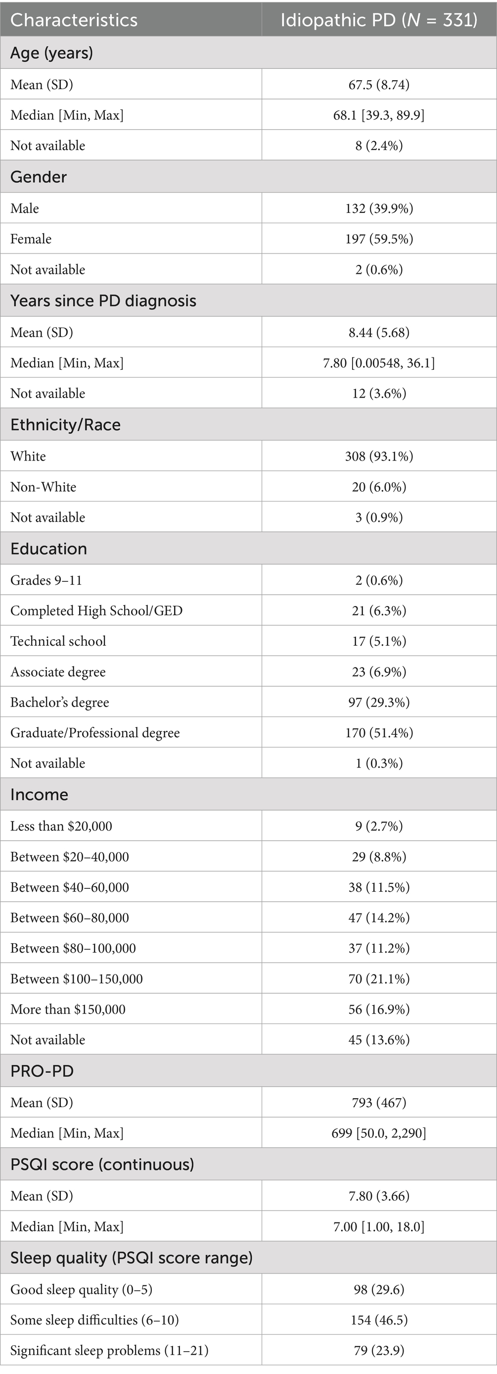 A total of 703 participants enrolled in the study during 2023. Among them, 524 (75% of total enrolled) reported a diagnosis of IPD. Of these, 193 participants did not provide information on their sleep patterns and behaviors, making it impossible to compute their PSQI scores; they were subsequently excluded. The remaining 331 participants (47% of total enrolled) fully completed the PRO-PD questionnaire and were included in the analysis investigating the association between sleep quality and disease severity in the present study.