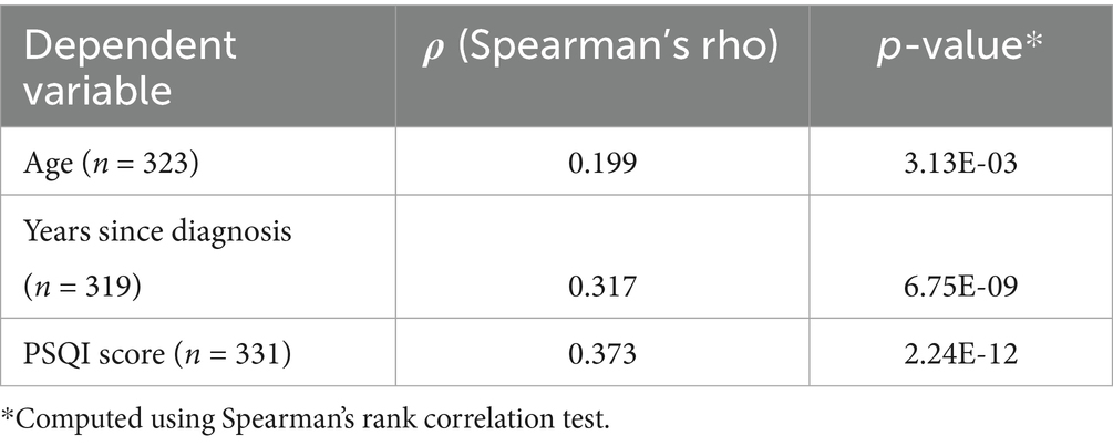 Despite the non-normal distribution of both PSQI and PRO-PD scores, as demonstrated by statistical tests (data not shown), a clear linear trend was observed in the scatterplot between the two variables. This relationship was further supported by a statistically significant positive correlation, as indicated by Spearman’s coefficient (rho = 0.373, p = 2.24 × 10−12) (Figure 2). A similarly strong positive correlation of PSQI was also observed with years since diagnosis, along with a slightly weaker but still significant positive correlation with age (Table 2).