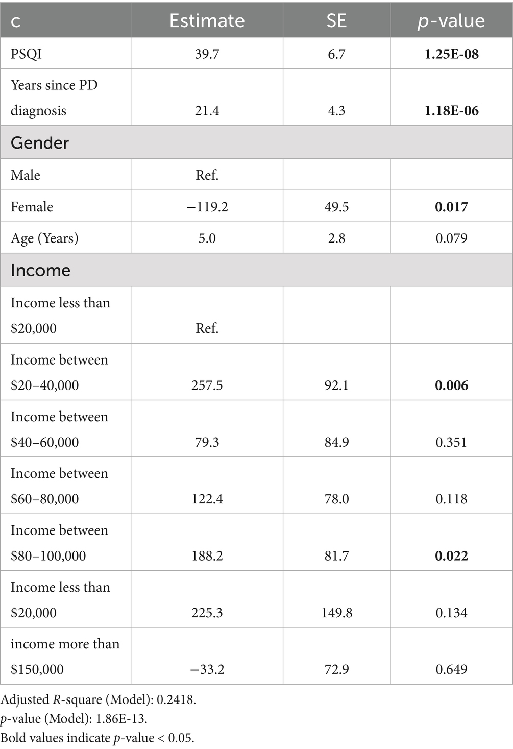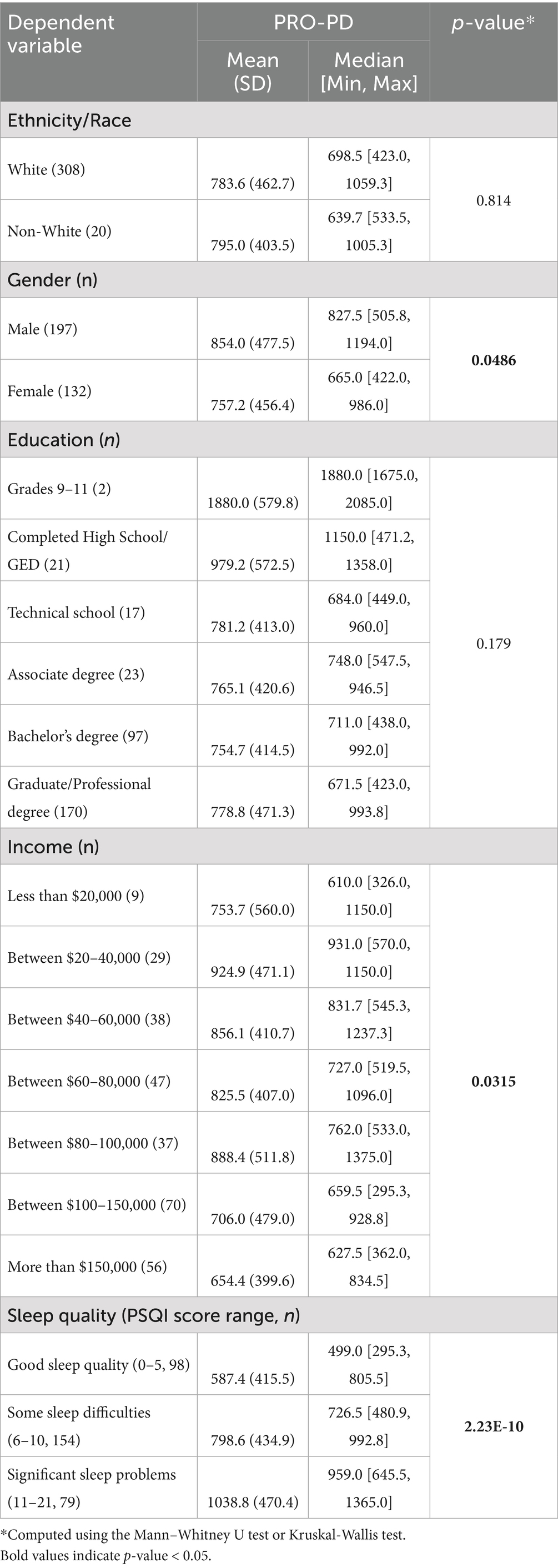 The effect of other covariates on PRO-PD demonstrated a nominally significant association with gender, where females had a considerably lower median PRO-PD score (665) compared to males (827.5) (Table 3). Additionally, income was associated with PRO-PD, with individuals earning a low to moderate income (20,000–60,000 USD per year) exhibiting higher PRO-PD scores, whereas those with very high income (>100,000 USD per year) had the lowest PRO-PD scores. This gap between low and high PRO-PD scores was particularly evident among individuals with significant sleep problems, who had a median score of 959 (range: 654.5 to 1365.0), compared to those with good sleep quality (median: 499, range: 295.3 to 805.5; p = 2.23 × 10−10).