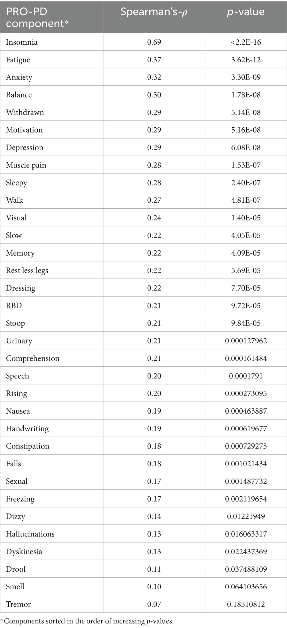 Disease severity was assessed using the PRO-PD score, which was computed from data collected through the PRO-PD questionnaire. This questionnaire evaluates 33 common PD symptoms, including both motor and non-motor symptoms, based on the participant’s self-assessment of symptoms over the past week. Each symptom was rated on an unnumbered sliding scale ranging from 0 (optimal health) to 100 (debilitation). The total PRO-PD score is the cumulative sum of all symptom ratings, ranging from 0 to 3,300, with each symptom weighted equally. Notably, most of the symptoms exhibit a correlation of less than 0.4 (Spearman’s-ρ) among themselves, highlighting the importance of capturing a diverse range of PD symptoms (Supplementary Figure 1).