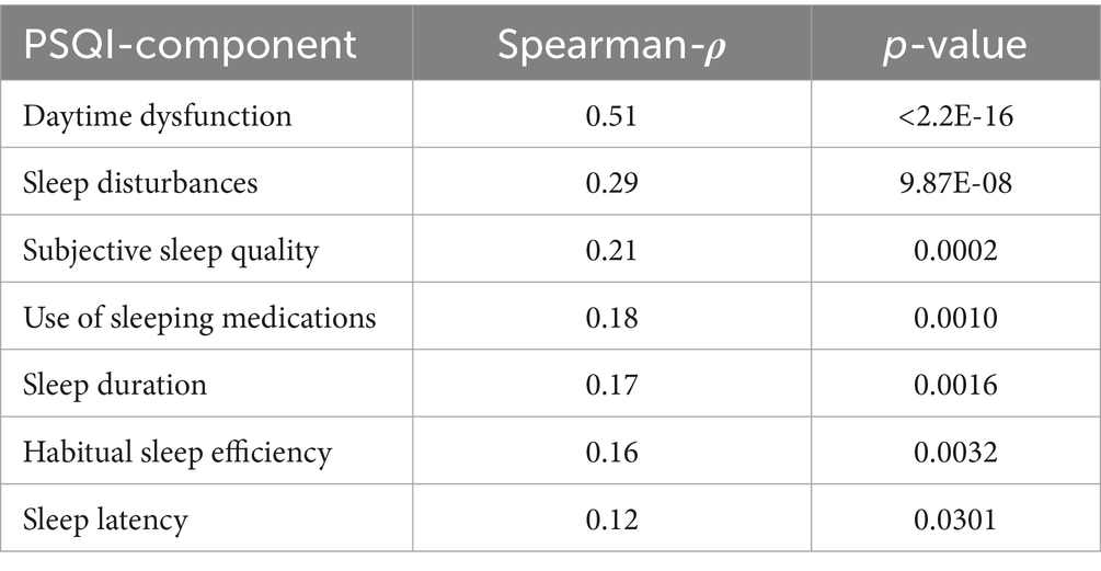 Sleep quality was assessed using the PSQI, a validated self-reported questionnaire designed to evaluate sleep quality and disturbances over the past month. The PSQI consists of 19 items generating seven component scores, including subjective sleep quality, sleep latency, sleep duration, habitual sleep efficiency, sleep disturbances, use of sleep medications, and daytime dysfunction. Each component is scored on a 0 to 3 scale, with a total PSQI score ranging from 0 to 21 (Mollayeva et al., 2016; Schrempf et al., 2014). Correlations among the seven PSQI components were found to be less than 0.5 (Spearman’s ρ) among all seven PSQI components within the study population (Supplementary Figure 2).