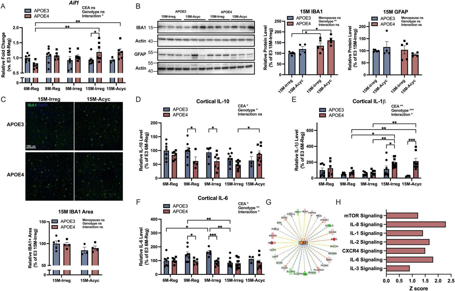 As shown in Figure 5A, Aif1/IBA1 RNA levels were significantly increased in APOE4 15M groups compared to APOE4 6M-Reg group, resulting in significant higher levels of Aif1 in APOE4 15M-Irreg group compared to APOE3 counterparts. Consistently, significantly higher IBA1 protein levels were observed in both APOE4 15M-Irreg and 15M-Acyc groups compared to APOE3 counterparts (Figure 5B), although cortical IBA1 + area did not differ significantly between APOE3 and APOE4 15M groups (Figure 5C). In contrast, glial fibrillary acidic protein (GFAP) protein levels were not different between genotypes nor across late perimenopausal transition (Figure 5B), confirming APOE4-specific microglial activation in PAM females. Consistently, compared to APOE3 counterparts, significantly lower anti-inflammatory IL-10 levels were observed in APOE4 9M-Reg and 9M-Irreg groups (Figure 5D), accompanied with a significant and persistent increase in pro-inflammatory IL-1β levels in APOE4 15M-Irreg and 15M-Acyc groups (Figure 5E), relative to APOE4 9M groups and APOE3 counterparts. In contrast, APOE3 females exhibited a transient increase in cortical IL-6 levels at 9M, which significantly decreased in APOE3 15M-Irreg group (Figure 5F). Bulk RNA-seq analysis (IPA) outcomes confirmed the upregulation of IL1B signaling in APOE4 15M-Irreg group (Figure 5G) which was predictive of activation of mTOR, IL-8, IL-1, IL-2, CXCR4, IL-6 and IL-3 signaling pathways in APOE4 15M-Acyc group, compared to APOE3 counterparts (Figure 5H).