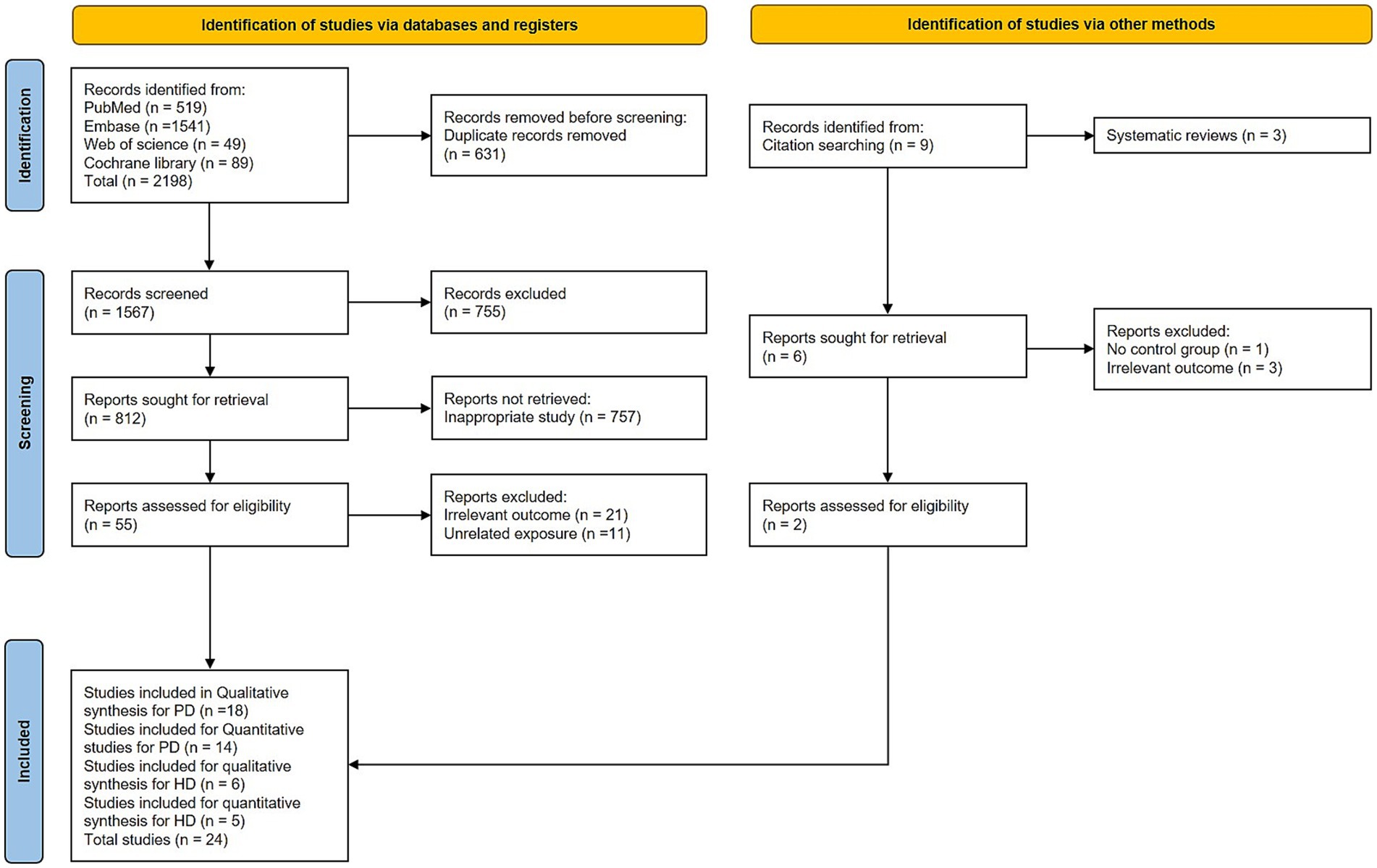 A total of 2,198 articles were identified through a database search. After removing duplicates, 1,567 articles remained for title and abstract screening, which led to the removal of 755 articles. The remaining 812 studies were subjected to primary and secondary screenings. Of these, 757 were excluded because they are irrelevant to our study focus, 21 were excluded for irrelevant exposure, and 12 were excluded for unrelated exposure, leaving 22 studies. Additionally, two more studies were identified through manual citation searches of the included studies. Of the 24 studies, 18 were deemed eligible for the systematic review of PD, whereas 14 (Bolitho et al., 2014; Breen et al., 2014; Catala et al., 1997; Fertl et al., 1991; Fertl et al., 1993; Kataoka et al., 2020; Li et al., 2020; Li et al., 2021; Lin et al., 2014; Milanowski et al., 2023; Uysal et al., 2019; Videnovic et al., 2014b; Wei et al., 2019; Zhang et al., 2021) were included in the meta-analysis of PD. For HD, 6 studies (Adamczak-Ratajczak et al., 2017; Aziz et al., 2009; Bartlett et al., 2020; Bartlett et al., 2019; Christofides et al., 2006; Kalliolia et al., 2014) fulfilled the eligibility criteria for the systematic review, and 5 studies (Adamczak-Ratajczak et al., 2017; Aziz et al., 2009; Bartlett et al., 2019; Christofides et al., 2006; Kalliolia et al., 2014) were included in the meta-analysis. The PRISMA flowchart representing the selection of studies is shown in Figure 1.