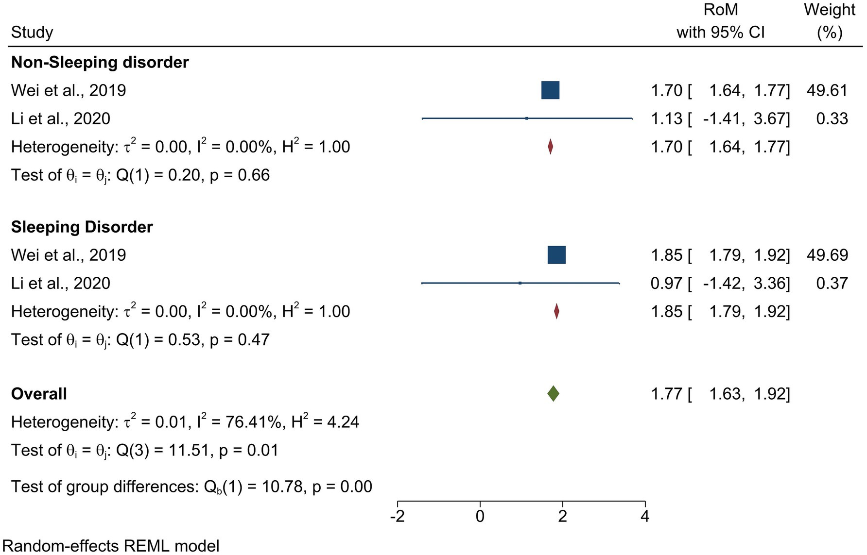 ![Forest plot comparing studies on non-sleeping and sleeping disorders. For non-sleeping disorders, Wei et al., 2019 shows RoM of 1.70, CI [1.64, 1.77], weight 49.61%. Li et al., 2020 shows RoM of 1.13, CI [-1.41, 3.67], weight 0.33%. For sleeping disorders, Wei et al., 2019 shows RoM of 1.85, CI [1.79, 1.92], weight 49.69%. Li et al., 2020 shows RoM of 0.97, CI [-1.42, 3.36], weight 0.37%. Overall RoM is 1.77, CI [1.63, 1.92]. Heterogeneity stats and model details included.](https://www.frontiersin.org/files/Articles/1637881/fnagi-17-1637881-HTML/image_m/fnagi-17-1637881-g004.jpg)