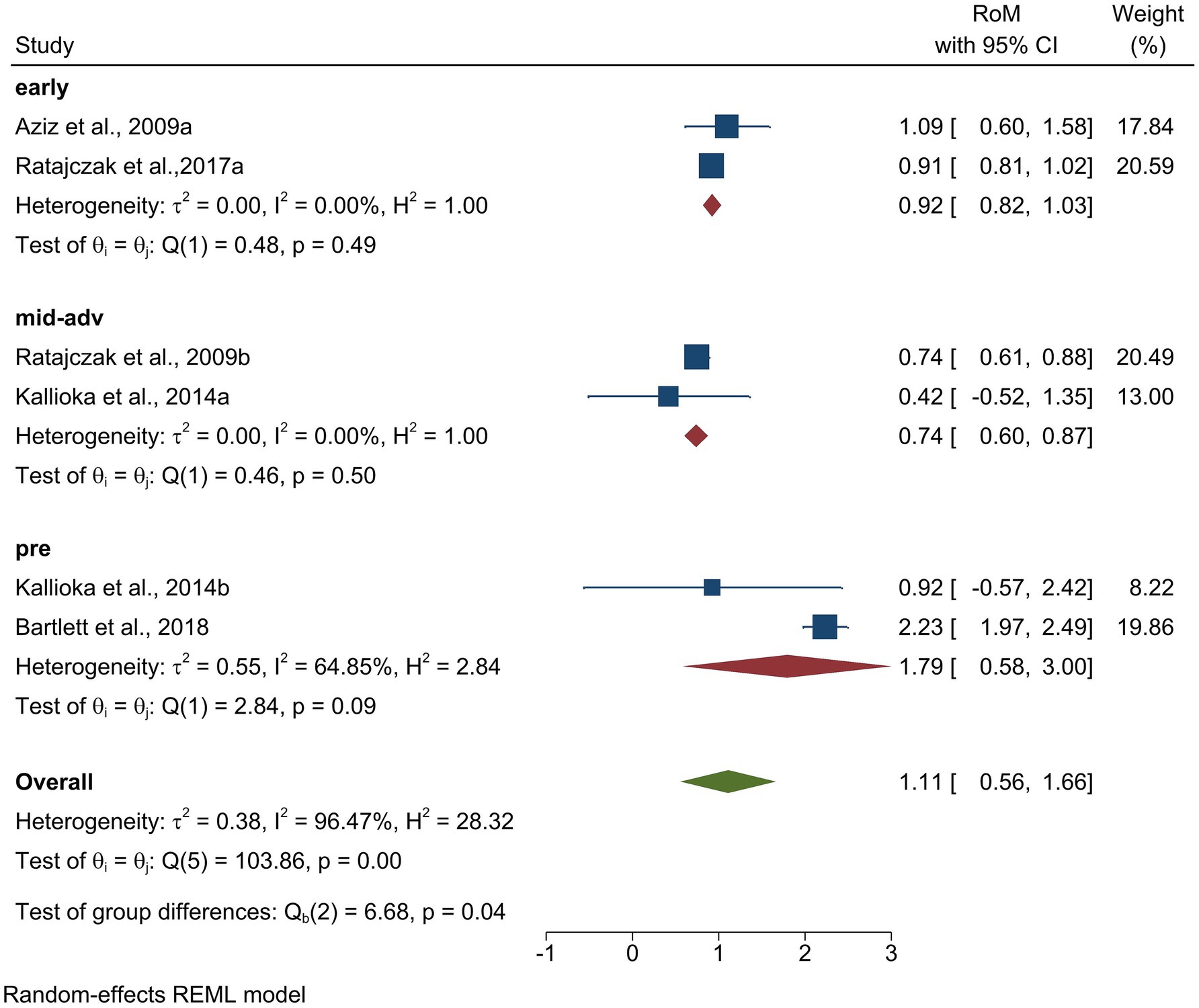 ![Forest plot from a meta-analysis showing the range of motion (RoM) with 95% confidence intervals (CI) and study weights for different stages: early, mid-advanced (mid-adv), and pre. Each study is represented by a blue square, with size indicating its weight, and a horizontal line showing the CI. The diamond shapes represent the pooled effects for each stage and overall. Heterogeneity metrics and statistical tests are provided for each category. The overall RoM estimate is 1.11 with a CI of [0.56, 1.66].](https://www.frontiersin.org/files/Articles/1637881/fnagi-17-1637881-HTML/image_m/fnagi-17-1637881-g005.jpg)