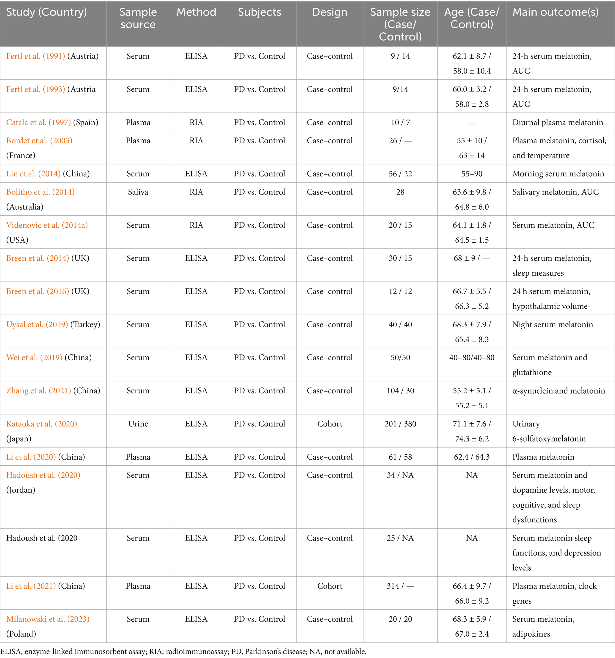 The characteristics of the eligible articles on PD and HD are detailed in Tables 1, 2, respectively. All included studies had case–control or cohort designs. Among the 18 PD studies, 16 were case–control and the remaining 2 were cohort studies, while in HD, all 6 studies were case–control studies. In the PD studies, 1,061 patients and 1,019 control subjects were analyzed. Among the PD patients, 137 (12.91%) were unmedicated, whereas 924 (87.09%) were on dopamine medication. The six HD studies included 78 healthy controls, 67 premanifest HD patients, 44 manifest HD patients, and 8 prodromal-stage HD patients. Melatonin levels from various sources have been analyzed in both PD and HD studies. Among the included studies for analysis in PD, 12 studies (66.67%) used serum, 5 studies (27.78%), and 1 study (5.56%) used saliva. And 6 studies (33.33%) analyzed 24 h, 9 studies (50%) analyzed morning, 1 analyzed habitual sleep time, 1 analyzed diurnal (11 a.m. and 12 p.m.), and 1 analyzed at 12 p.m. and 5 a.m., with 5.55% each. In HD, 2 studies used serum and plasma 40% each, and 1 study used saliva (20%), and 3 studies analyzed 24-h data (20% each). In PD, 14 studies used enzyme-linked immunosorbent assay (ELISA), and 4 studies used radioimmunoassay (RIA), and in HD, 3 studies used ELISA and 3 studies used RIA as their analytical method.