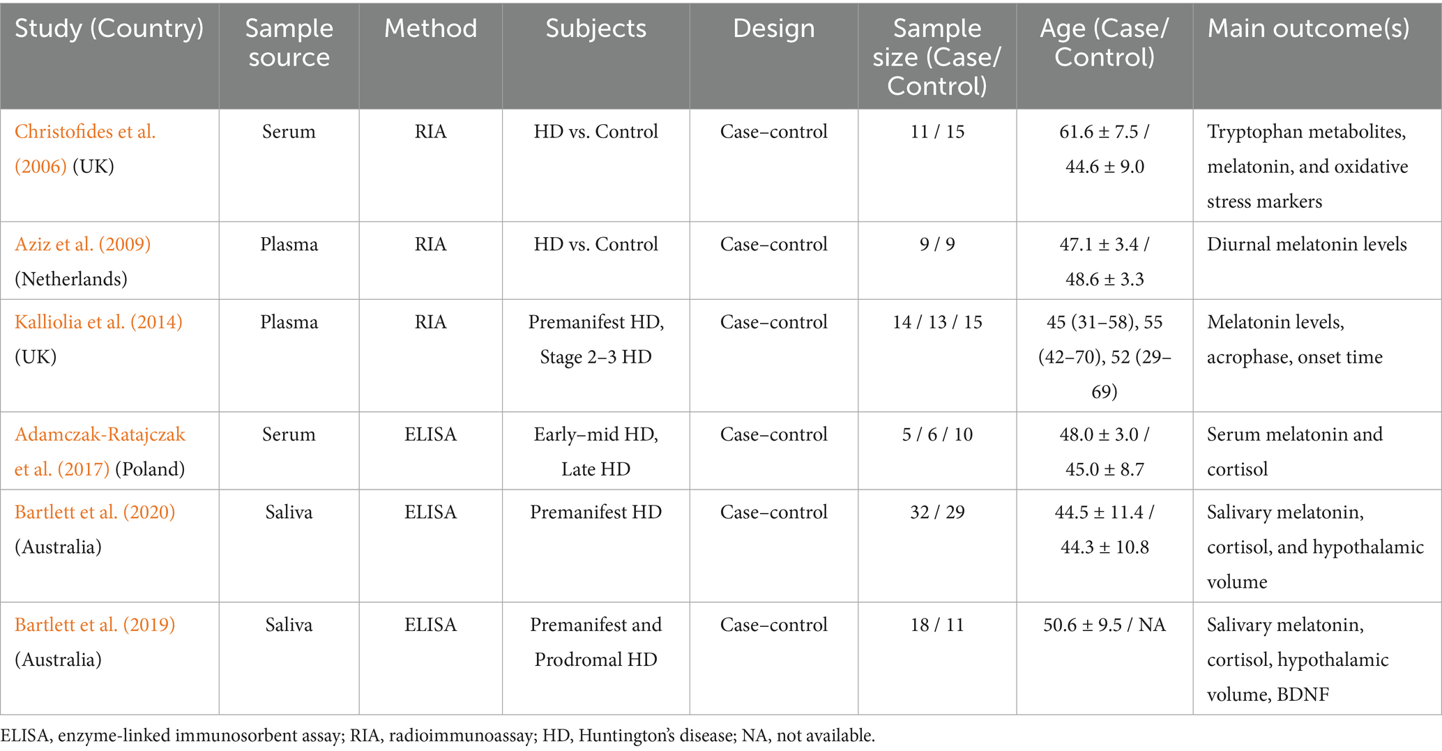 Given these findings, melatonin emerges as a promising candidate with diagnostic significance before the onset of motor symptoms in both PD and HD patients. There is promising but inconsistent evidence regarding melatonin’s role in PD and HD progression, emphasizing the need for further investigation (Kim et al., 2023; Li et al., 2020). Questions remain about how dopaminergic treatments impact melatonin secretion in PD (Lin et al., 2014; Videnovic et al., 2014b) and how their rhythm is different in PD patients with or without sleep disorders. Therefore, through this systematic review and meta-analysis (SRMA), we aim to explore how endogenous melatonin rhythm has been disrupted in PD and HD by examining the amplitude (half distance between the highest and lowest points of melatonin) and area under the curve (AUC), which indicates the total amount of melatonin secreted in 24 h in PD, and the amplitude and acrophase (peak level of melatonin concentration during a circadian rhythm) of melatonin rhythm in manifest HD. We also examined how melatonin levels are influenced by various factors in PD and HD, including disease stage, duration, sex, and age in PD as well as stage and CAG repeat expansion in HD. Ultimately, this research seeks to determine whether melatonin holds potential as a reliable biomarker for both diseases, with implications for diagnosis and treatment.