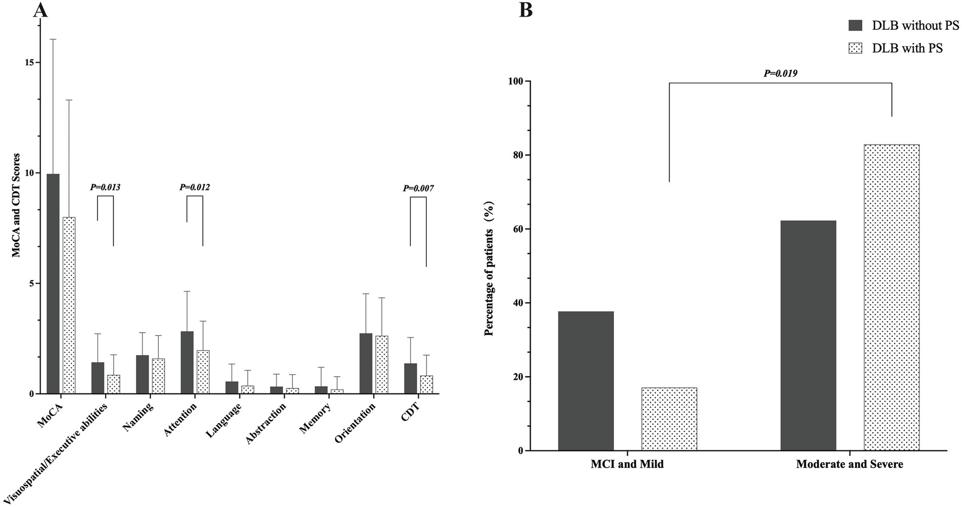 Methods: This study included 35 DLB patients with PS and 183 DLB patients without PS. We compared cognitive function across different domains using the Montreal Cognitive Assessment (MoCA) and its subdomains, and the Clock Drawing Test (CDT), and dementia severity using the Clinical Dementia Rating (CDR). The prevalence and severity of neuropsychiatric symptoms and caregiver distress were measured using the Neuropsychiatric Inventory (NPI) and Zarit Burden Interview (ZBI).