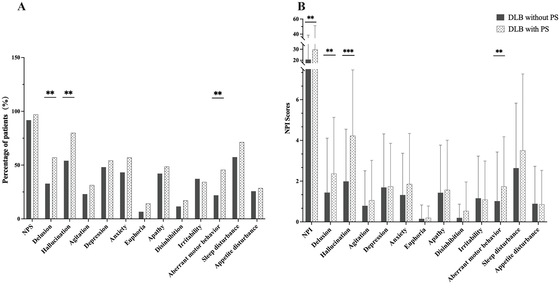 Figure 2. Neuropsychiatric symptoms in DLB patients with and without PS. (A) Prevalence of specific neuropsychiatric symptoms, as measured by the NPI. Data are presented as the percentage of patients in each group (n = 35 for DLB with PS; n = 183 for DLB without PS). Between-group comparisons for each symptom were analyzed using the Chi-square test. (B) Severity of neuropsychiatric symptoms, represented by the composite score from the NPI. Data are presented as mean ± standard deviation. Between-group comparisons were performed using the Mann–Whitney U-test. DLB, dementia with Lewy bodies; PS, Pisa syndrome; NPI, Neuropsychiatric Inventory; NPS, neuropsychiatric symptoms; p < 0.05 was considered statistically significant. ∗∗p < 0.01; ∗∗∗p < 0.001.