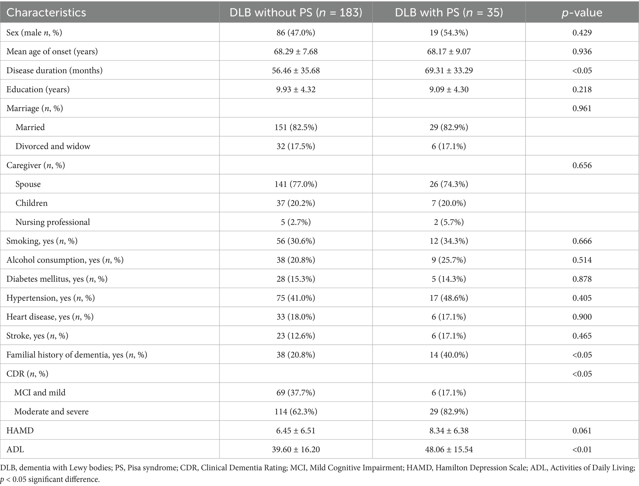 Our study highlights that DLB patients with PS exhibit more severe NPS and greater impairment in activities of daily living, as evidenced by their significantly higher ADL scores. QoL in DLB is influenced by multiple factors (Roberts et al., 2017), including progressive cognitive decline that disrupts social/occupational functioning and ADL (Mirza et al., 2022; Guo et al., 2023). Ye et al. (2017) reported significantly reduced QoL in PD with PS patients, though some studies (Tinazzi et al., 2015) argue that PS itself may not be the primary determinant, with disease duration and other factors playing contributory roles. NPS in DLB are strongly associated with QoL deterioration (Mirza et al., 2022; Guo et al., 2023; Kang et al., 2023). Patients with PS typically have longer disease duration, more severe dementia, and more pronounced motor impairments, all of which may amplify neuropsychiatric manifestations and QoL decline.