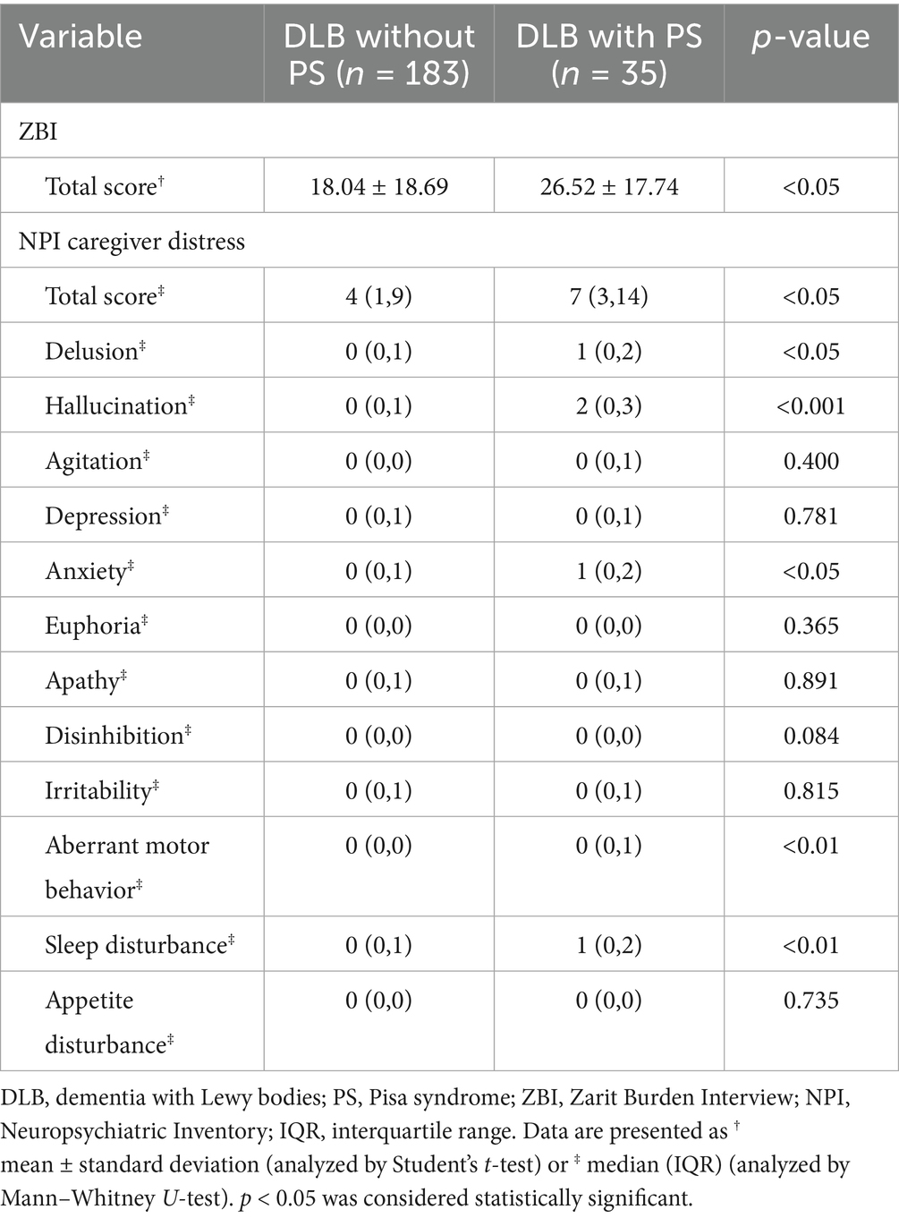 In our study, patients with PS exhibited more severe caregiver distress and a higher overall caregiving burden, particularly due to symptoms such as delusion, hallucinations, anxiety, aberrant motor behavior, and sleep disturbance. These findings suggest that PS and NPS synergistically interact, compounding caregiver distress and burden, while profoundly impacting caregivers’ QoL and mental health. Such comorbidities are highly prevalent among individuals with PD (Elefante et al., 2021). For caregivers of DLB patients with PS, who often contend with a double burden of severe NPS and disabling postural disorder, the heightened distress levels we observed underscore an urgent need for targeted support. This may provide critical insights for refining caregiving strategies and priorities, ultimately alleviating burden and improving the overall caregiving experience.