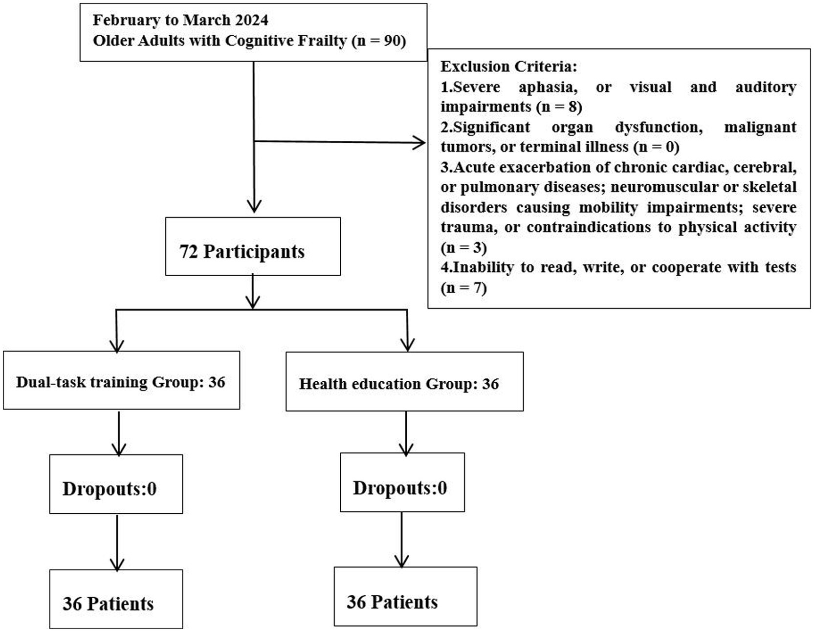 Methods: This randomized controlled trial enrolled older adults with CF at community health service center in Chaoyang District, Beijing, between February and March 2024. Participants were randomly assigned to either the dual-task training group or the health education group in a 1:1 ratio. The dual-task training group received an exercise-cognitive dual-task training program, while the health education group received information on CF, including its symptoms, risk factors, and non-pharmacological prevention and treatment strategies. The primary outcomes were frailty status, while the secondary outcomes included cognitive function, balance and gait function, walking ability, and dual-task cognitive load.