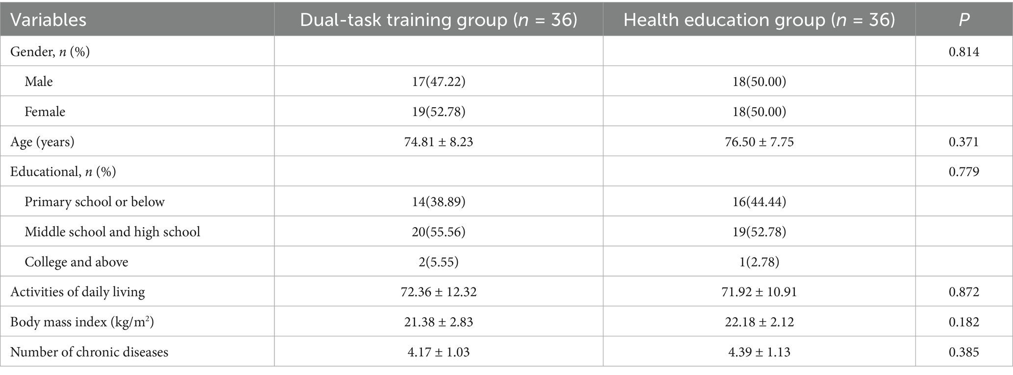 A total of 72 participants (35 males) were included in the study (Figure 1), with 36 participants in each group (dual-task training group and health education group). No participants withdrew from the study. The mean age of participants in dual-task training group was 74.81 ± 8.23 years, while mean age of health education group was 76.50 ± 7.75 years. In the Dual-task training Group (n = 36), there were 17 males (47.22%) and 19 females (52.78%), the mean score of Activities of Daily Living (ADL) was 72.36 ± 12.32, and the mean Body Mass Index (BMI) was 21.38 ± 2.83 kg/m2. In the health education group (n = 36), there were 18 males (50.00%) and 18 females (50.00%), the mean score of ADL was 71.92 ± 10.91, and the mean BMI was 22.18 ± 2.12 kg/m2. In the dual-task training group, 20 out of 36 participants (56%) had completed middle or high school education, compared to 19 out of 36 participants (53%) in the health education group. No significant differences were observed between the two groups in terms of gender (p = 0.814), age (p = 0.371), education level (p = 0.779), daily living activities (p = 0.872), body mass index (BMI) (p = 0.182), or chronic diseases (p = 0.385) (Table 1).