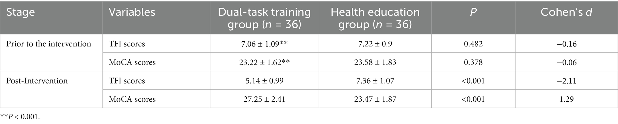No participants withdrew from either group during the intervention. Prior to the intervention, no significant differences in TFI scores was observed between the dual-task training group and the health education group (7.22 ± 0.9 vs. 7.06 ± 1.09, p = 0.482). After the intervention, the TFI frailty score in the dual-task training group significantly decreased (7.06 ± 1.09 vs. 5.14 ± 0.99, p < 0.001). A statistically significant difference was also observed between the dual-task training group and the health education group post-intervention (5.14 ± 0.99 vs. 7.36 ± 1.07, p < 0.001). In contrast, no significant difference was observed in the health education group between pre- and post-intervention assessments (p > 0.05) (Table 2).